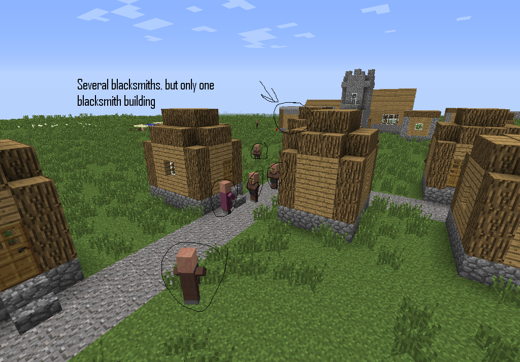 As the pictures show, there are more Blacksmiths than Blacksmith Shops, and more Priests than Churches. (I messed up in the pictures a little; there are no issues with the Library and Librarian spawn, or the Butcher Shop and Butcher spawn.)