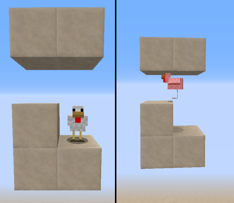 When chickens jump under a 1 block high place (a low tree for example) they take suffocation damage. It is bad enough that every time I try to lead a chicken to my farm, it dies before I get there. I don't know if this effects other small mobs or not.