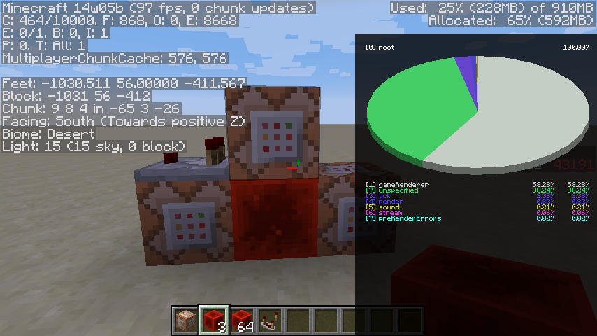 Using the "/setblock ~ ~1 ~ redstone_block 0 destroy" command in a command block, whenever the command block triggers, it will destroy and replace a redstone block powering it, causing it to trigger again, and creating a very fast clock that is very useful to power other command blocks, and that works great in 1.7.4. In these snapshots (and possibly others), after about 45 minutes of running this clock continuously (during which time the block is replaced 42.7 thousand times), the server will begin to intermittently freeze. In singleplayer, you are still able to move around (sometimes with severe lag, other times with no lag), but the clock stops, as do any mobs and other redstone circuits. Every few moments, all (or most) of the ticks that were supposed to happen while the server was frozen will happen at once, and then the server will freeze again. Attempting to place a block and then another block on top of it results in the second block disappearing the next time ticks happen, and also can lead to difficulty moving. CPU usage is at maximum; there is no significant increase in use of memory. Upon exiting the world, the main menu UI is less responsive, and closing the game takes several seconds, during which time Windows labels the process as (not responding). Attached is a video of my first encounter with the bug; I have also tested an empty world containing only this clock with no scoreboard incrementing or other redstone running and encountered the same behavior.