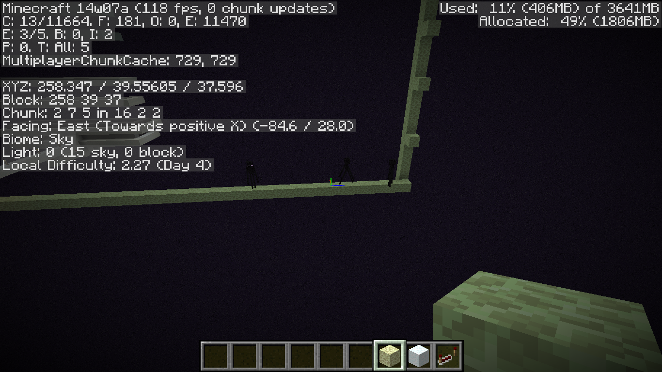Instead, no Endermen spawned. Endermen do spawn without a problem on the End island however outside of that boundary if a platform of sort has been built no entities exist. No matter the difficulty, the range from the End island, or the height of platforms, Endermen refuse to spawn.