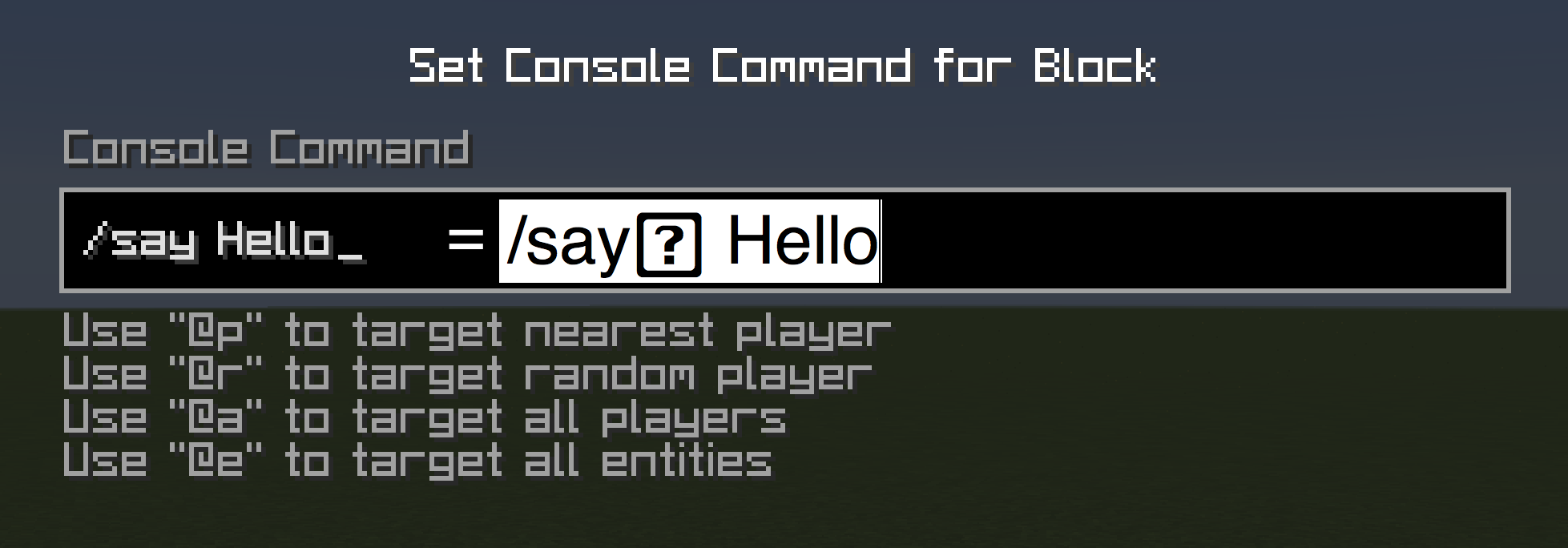 3. Power the command block with redstone and it says unknown command because pressing the arrow key inserted a character after "say", so the command block saw "say(character here)" and didn't recognize the command. (An invisible character was inserted into the command. You can tell because if you hit backspace on it, then the cursor doesn't move.)
