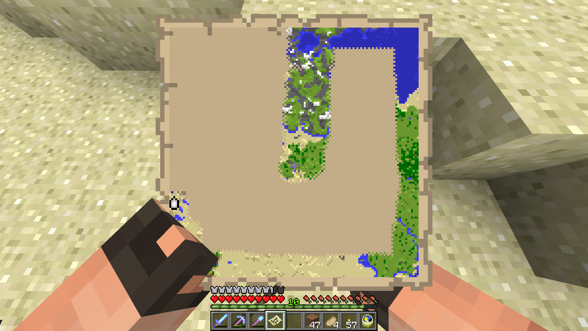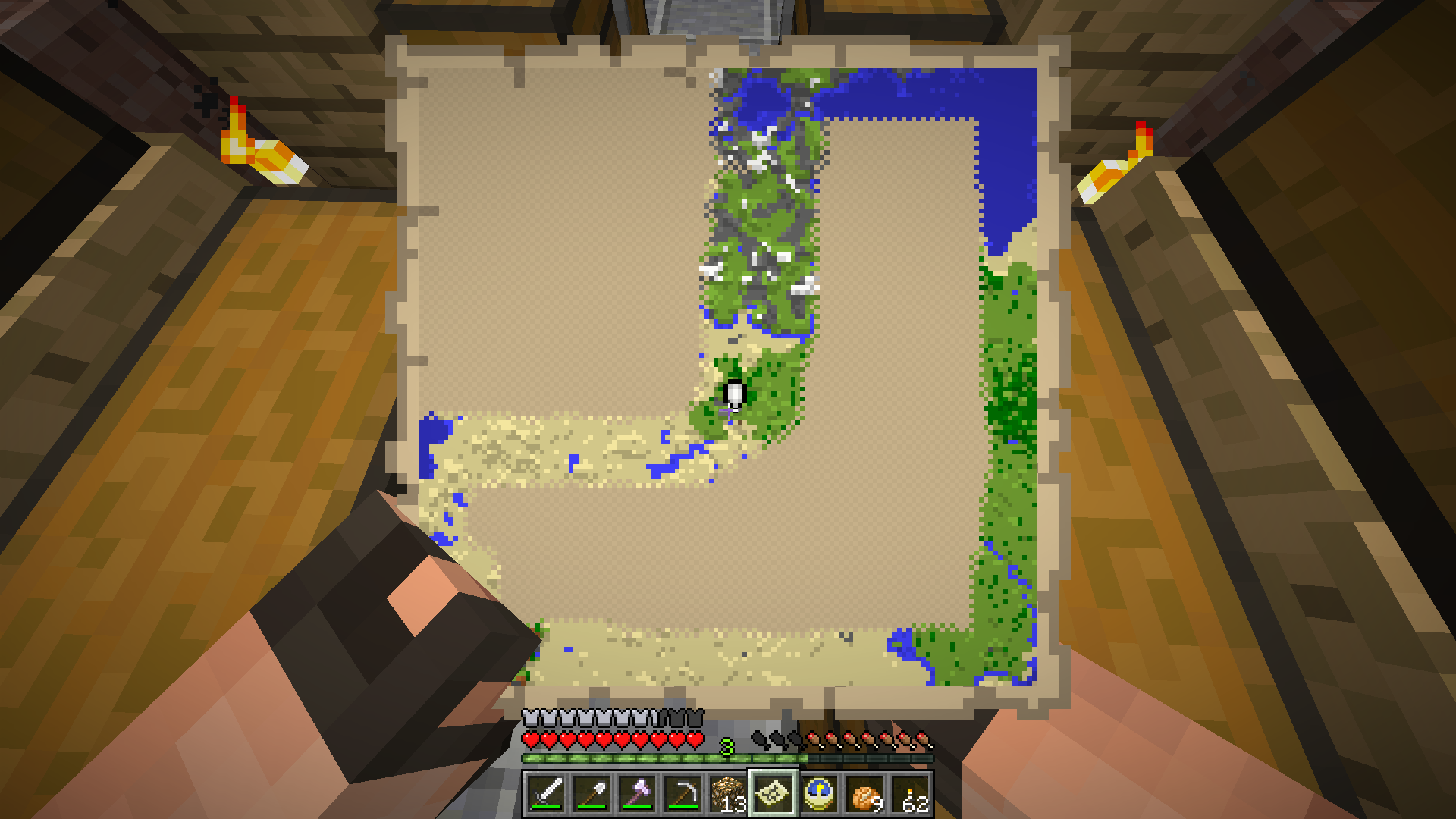 While holding the map in first person view (on a horse and normally) the bottom left hand corner is blocked by players left hand.