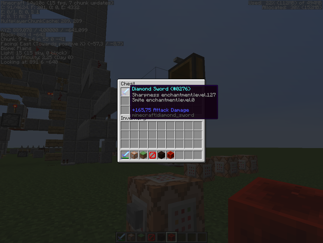 /blockdata ~ ~2 ~ {Items:[{id:276,Count:1,tag:{ench:[{id:16,lvl:127},{id:17,lv:127}]}}]}The sword in tge chest shows this: