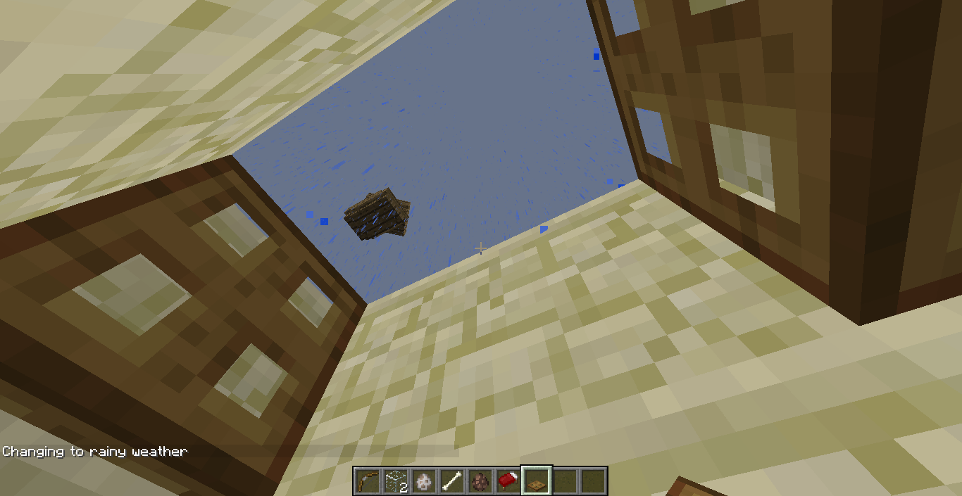 I forced the weather rainy and I went into my hidden place and the rain hit the open trapdoors and "I didn't get wet" and the rain hit the open trapdoors as if it was closed.