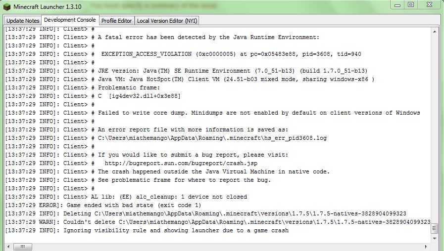 I thought that once I pressed the play button, Minecraft would open and I would be able to play the game. But when I did press play, it showed the loading Mojang screen, then it crashed and brought me back to the main screen. I will attach a screenshot of what the Game Launcher says happened. I've tried deleting my .minecraft folder than re-installing it, but the same error occurred.