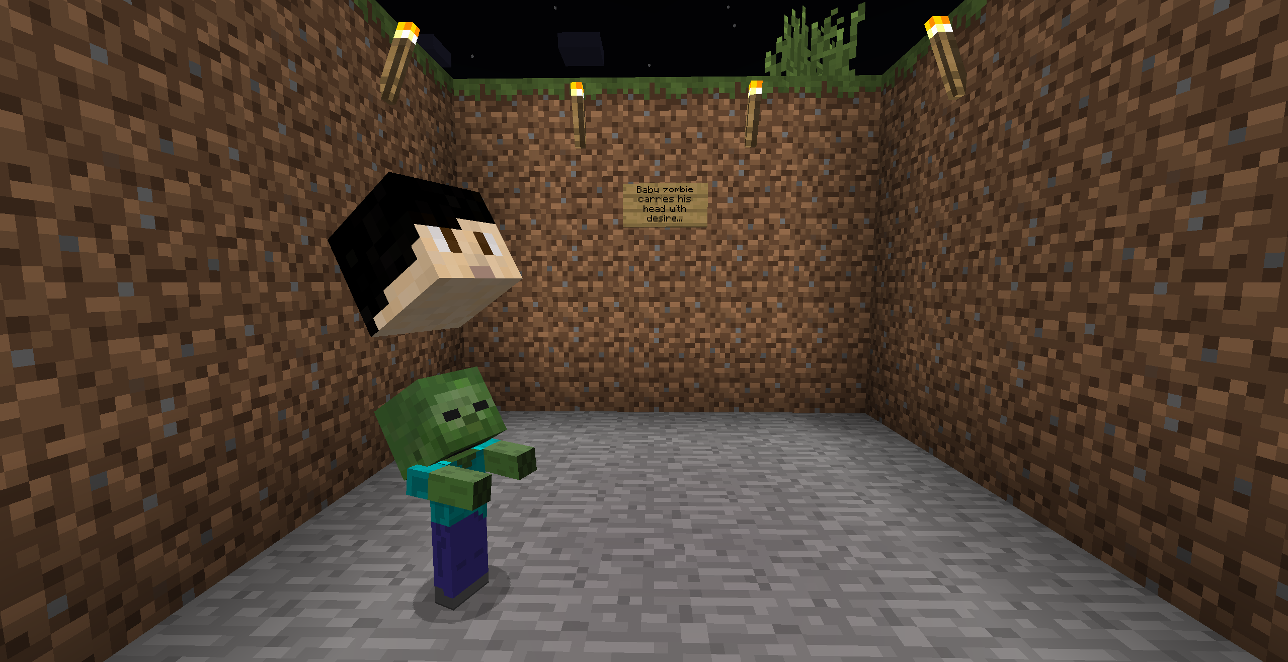 Baby zombies can wear helmets that shrink down to their size, but nevertheless, if you do /summon Zombie ~ ~ ~ {Isbaby:1,CanPickUpLoot:1}, and give it a player skull, it will not wear it like a helmet, it will carry it as if it were an entity riding it.