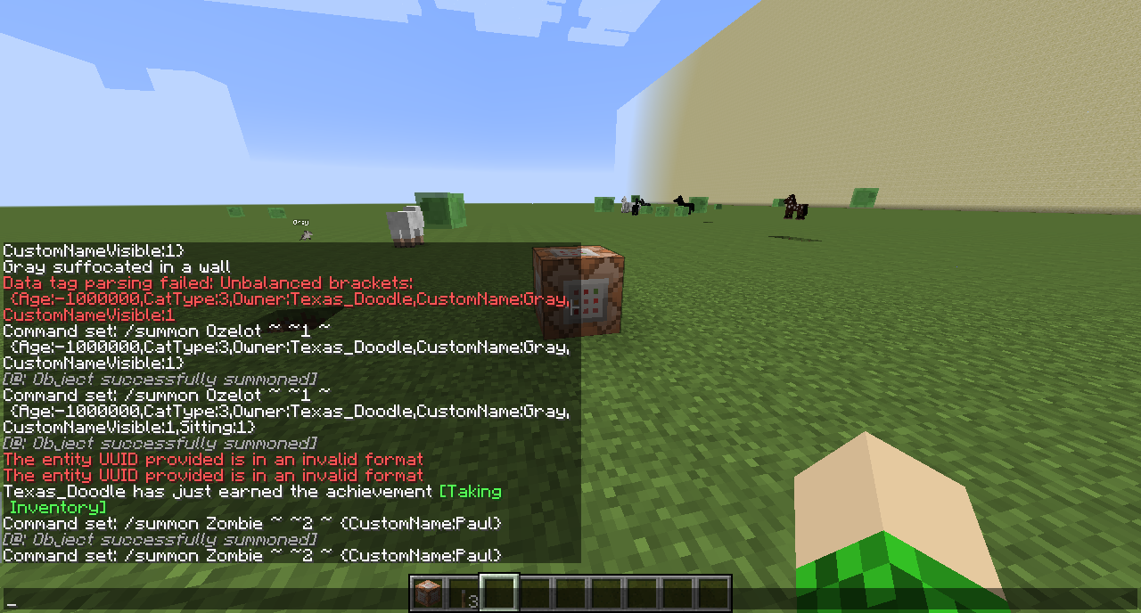 I was playing around with command blocks, trying to see what I could do with /summon, when I made a particularly long command, which summoned a baby siamese ocelot sitting down with a custom name of Gray, which was always visible. After accidentally suffocating poor Gray, I noticed in the chat that it said: "Gray suffocated in a wall". That confused me. Why did it notify me that the cat had suffocated?