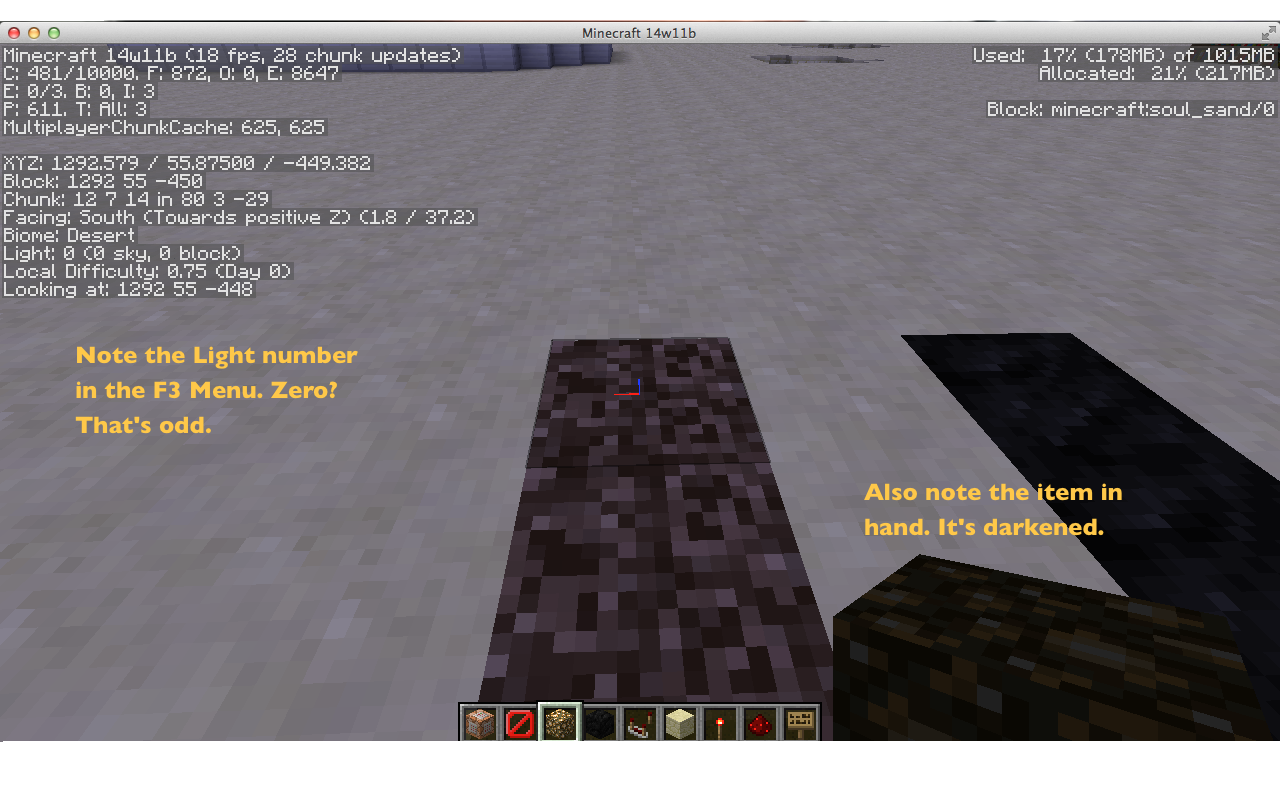 When on soul sand, the lighting is reduced as if you were in the block (0 out of 15), causing items in hand turns black.