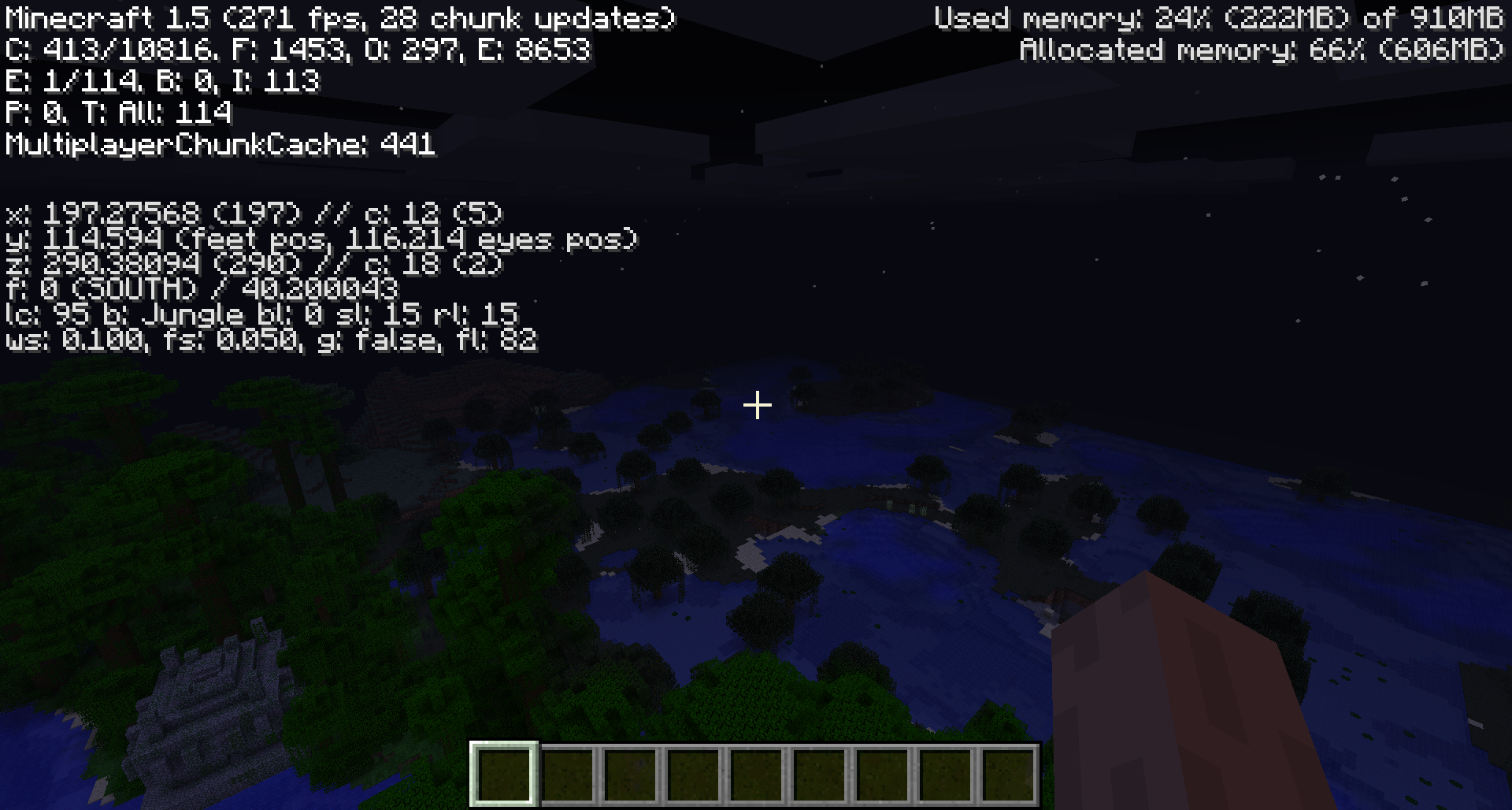 In single player, the chunk loading distance appears to be lower than intended. As far as I can tell, they load to the default server distance of 10. This causes the edge of the world to be quite visible, before the fog starts affecting it.
