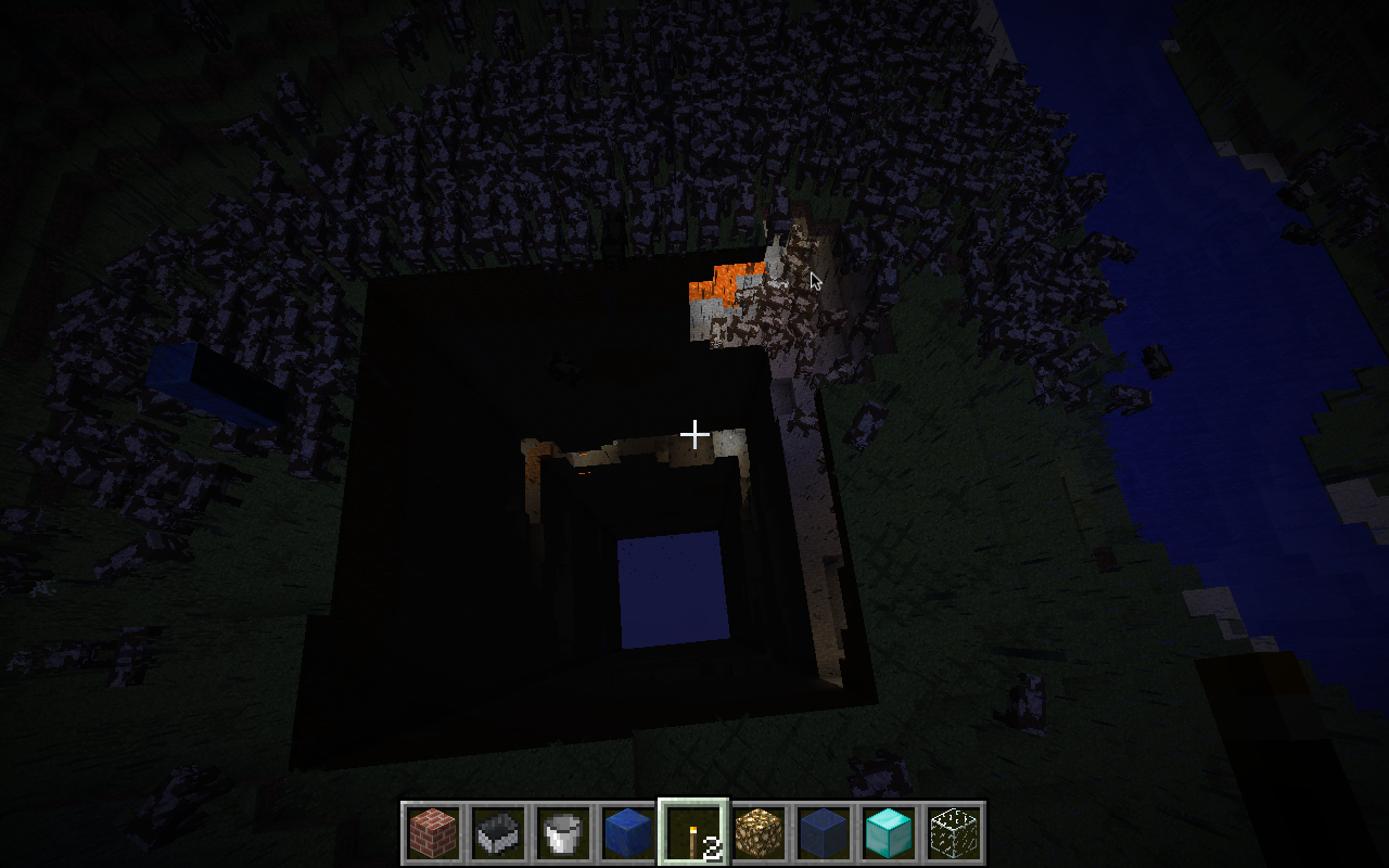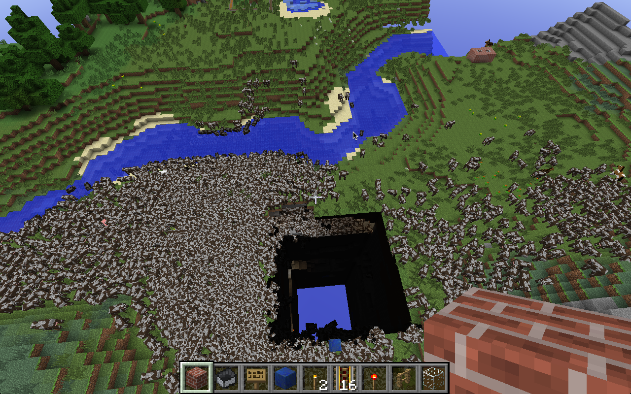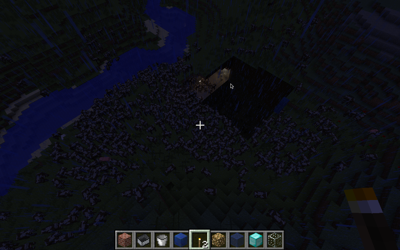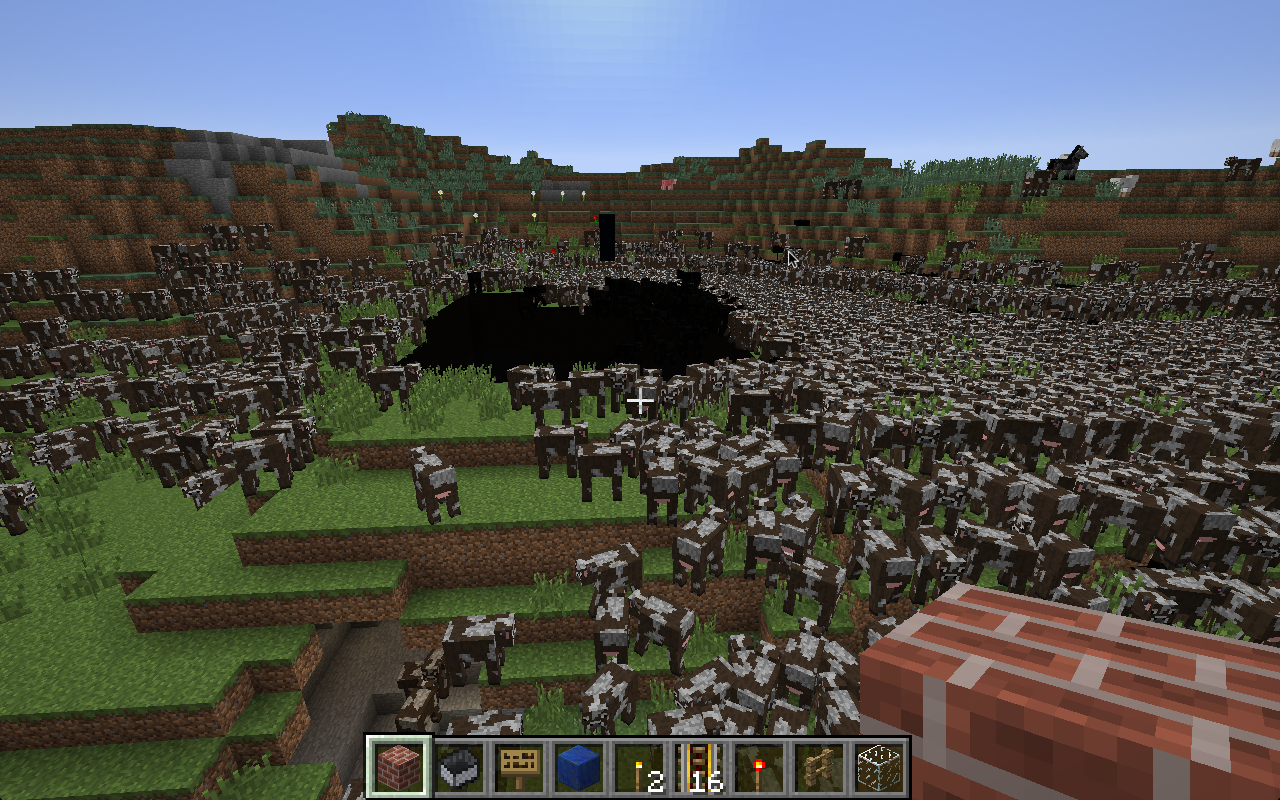 Well, when I play Minecraft, Across the river from my little town, there's a giant group of corrupt blocks. It looks like a big black square that has a blue bottom that I can't move down in to it. Ever since these blocks have been there, the game has been freezing and crashing. Sometimes I can't even get on to mine craft. When I select my world, it sits there for a few minutes. Then, It goes back to the title screen. Also, Thousands of Cattle randomly generate (See photo)