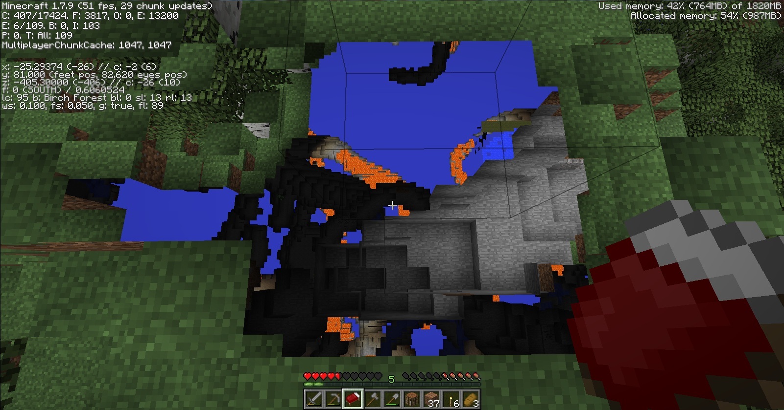 Would see random chunk floating approx. 15-20 above unloading/corrupt areas. F3 + A fixes it and breaking a block in the area fixes it. Block corruption also happened after in the area for length of time(had only been facing the other way for a short period of time). Was also seeing chunks that didn't pertain to the area, like lava or water blocks or trees that wouldn't be in that biome.