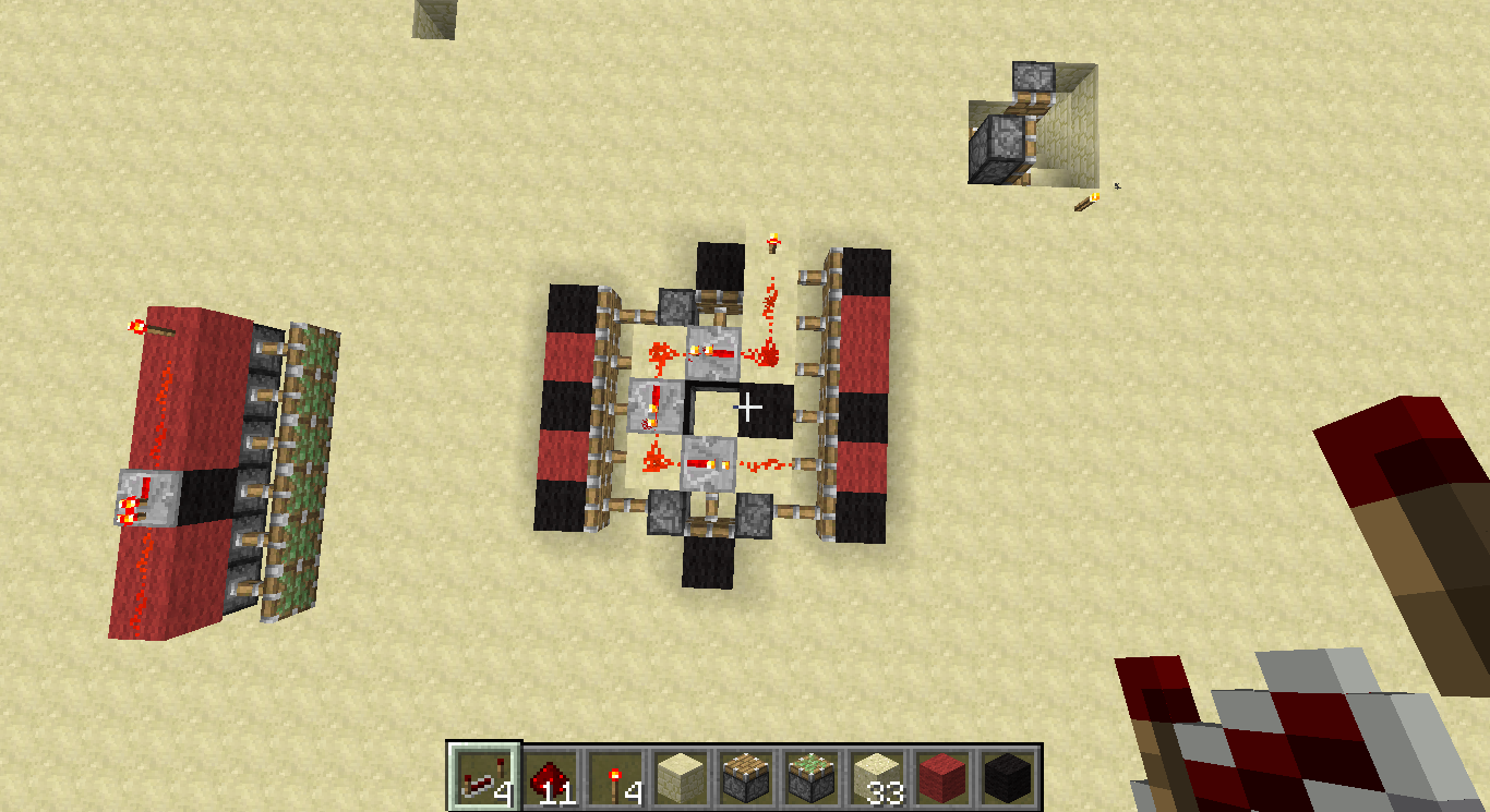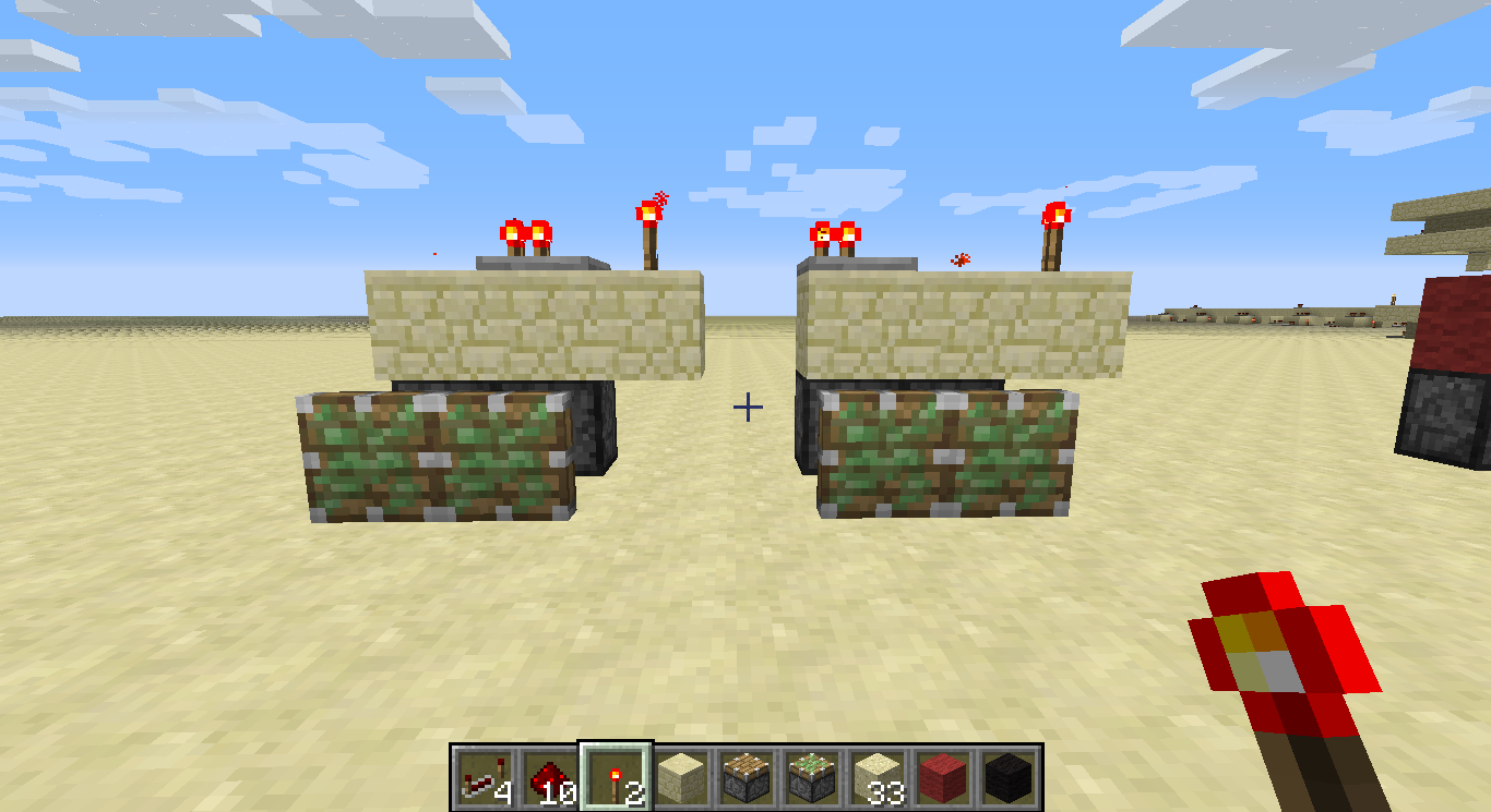 3. Put the torch, repeater and redstone on top of the sandstone (First pic)