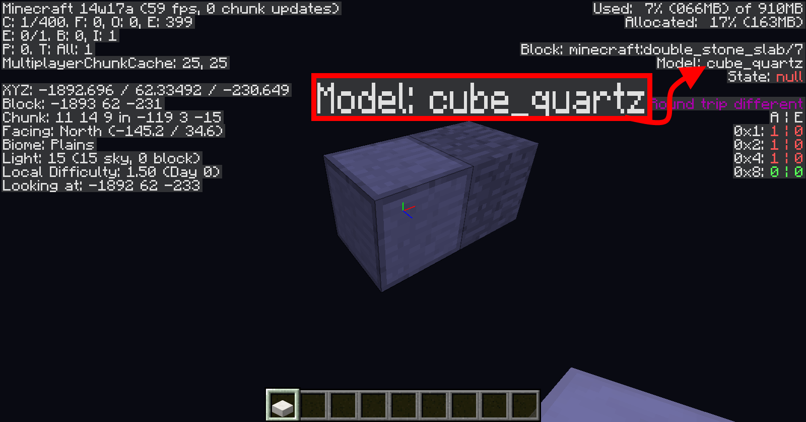 In the new Minecraft 14w17a snapshot, I have found a bug. When a player puts 2 Quart Slabs on top of each other, it turns them into the block that is supposed to come from 2 Stone Slabs.