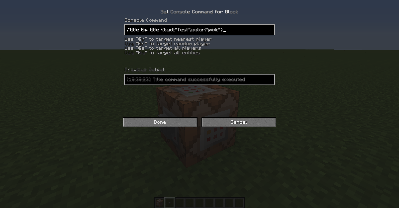/title @p title {text:"Test",color:"brown"}/title @p title {text:"Test",color:"pink"}2. Activate the command.