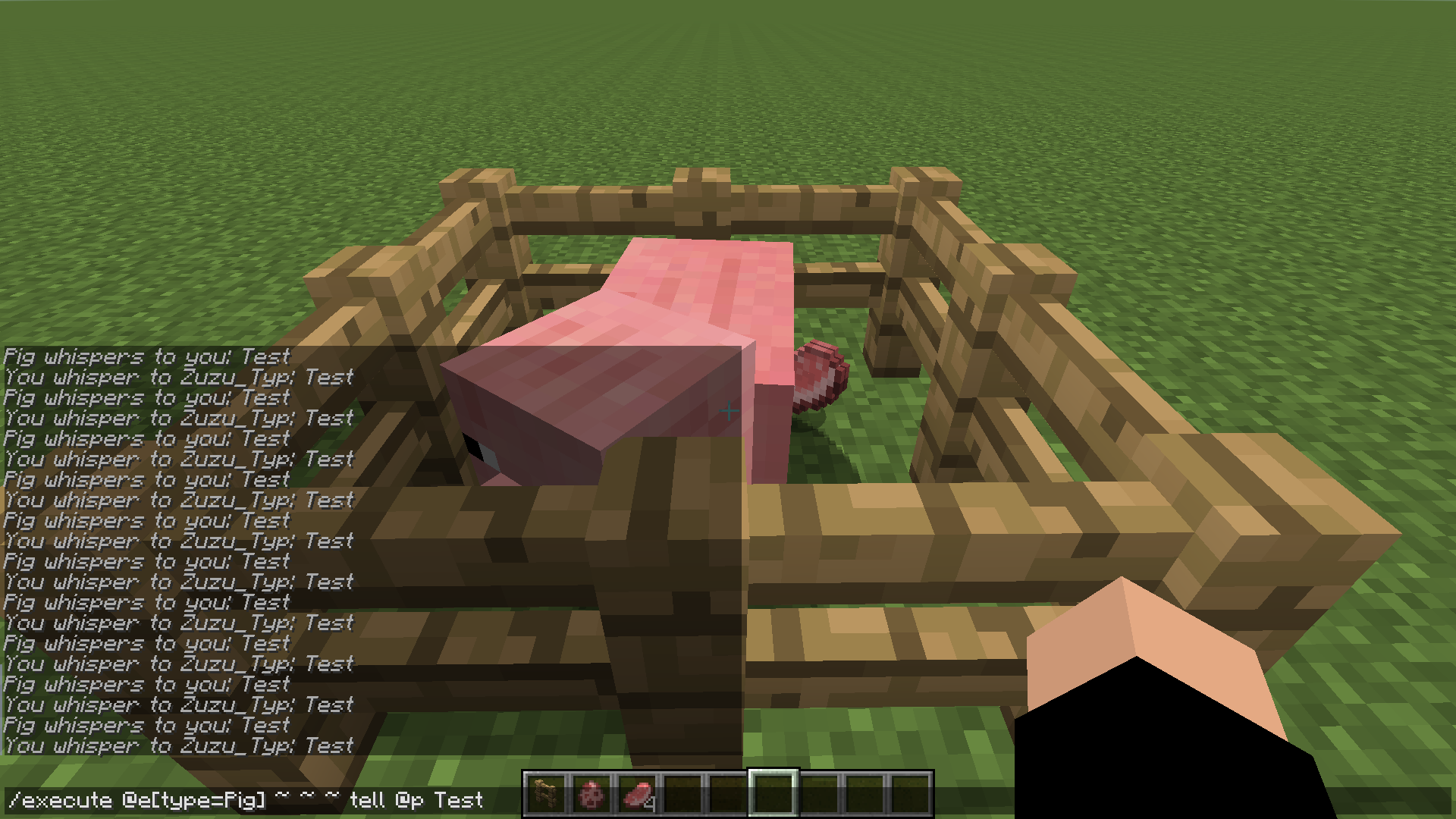 the pig should whisper "hi" to you. it does that, but you also whisper to yourself, but that shouldn't happen because you only specified the pig with [type=Pig], and not yourself. Also strange: you seem to be sending a whisper to yourself, but you don't get the message that (your name) whispers to you: hi