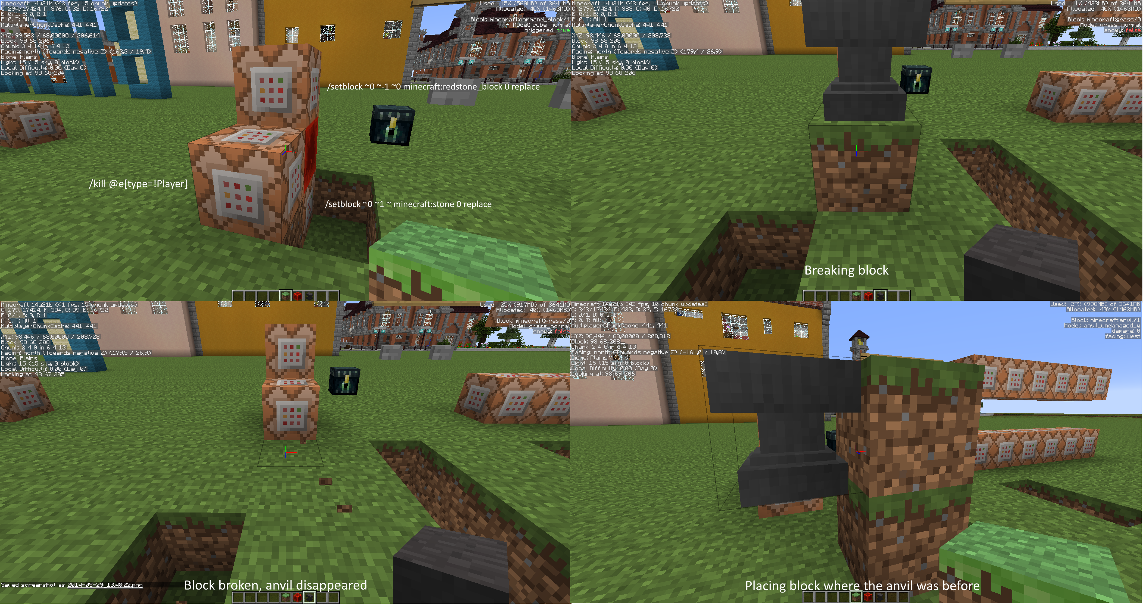 When you have a repeating command block (command: kill @e[type=falling_block]) and you let an anvil (sand/gravel/dragon egg) fall on the ground it doesn't fall, only the texture disappears. So it is still there as a ghost block (you can't walk through). When you update the anvil by placing a block where the anvil was before it appears, floating in the air.