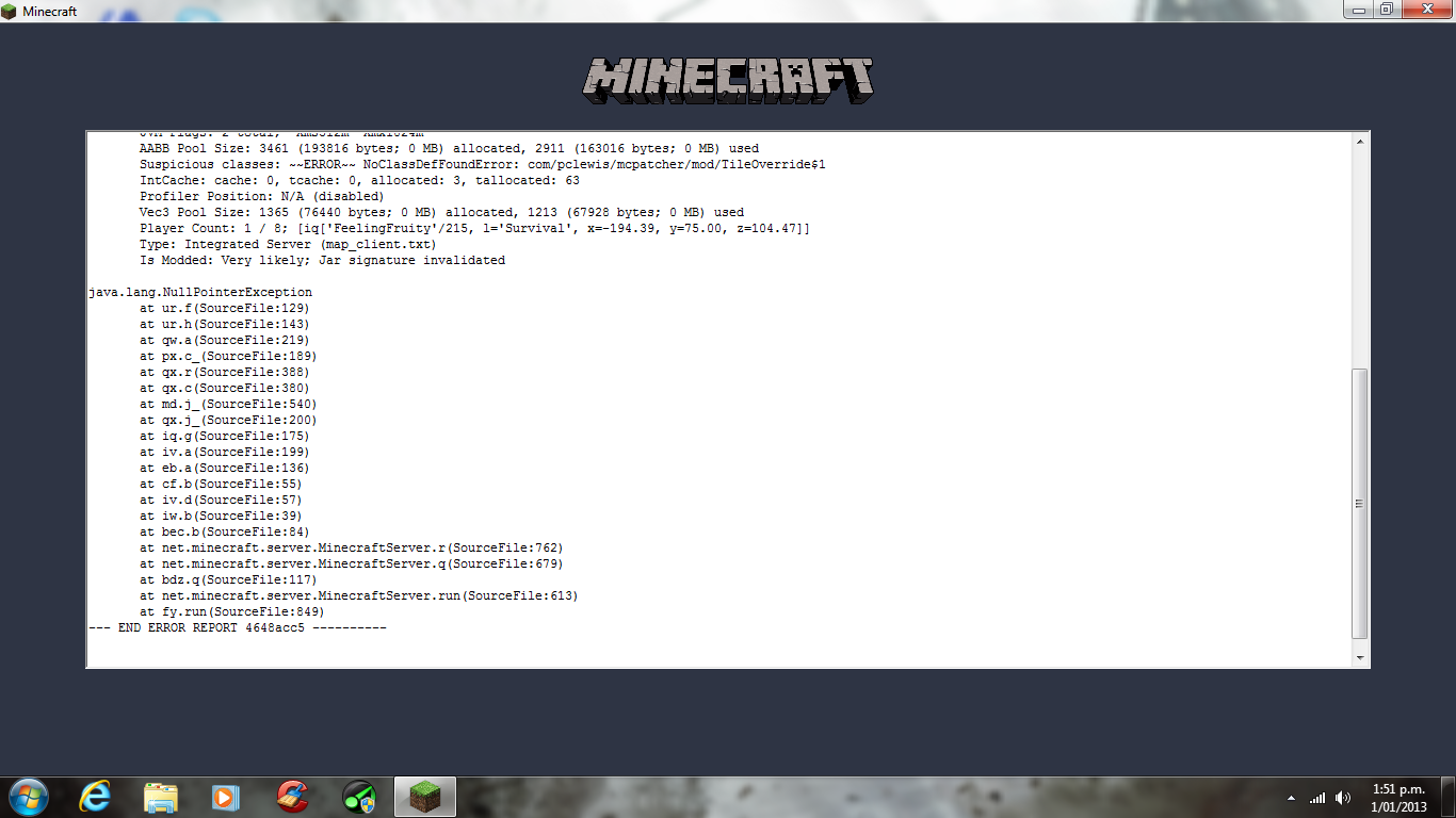 I have a noteblock and a jukebox beside eachother"pic1" and when i destroyed the jukebox and noteblock "pic2" it wouldnt freeze but when i go to pick them up it freezes and then i get a crash error as shown in images "crash1" and "crash2". I have also uploaded the crash report which is called "crash-2013-01-01_13.41.47-server.txt"
