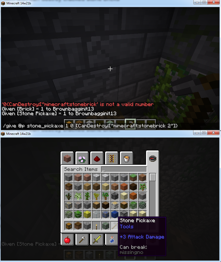 However, when trying to use a similar command to create a pickaxe that can destroy cracked stone brick i cannot find one that works, i am greeted with missingno.