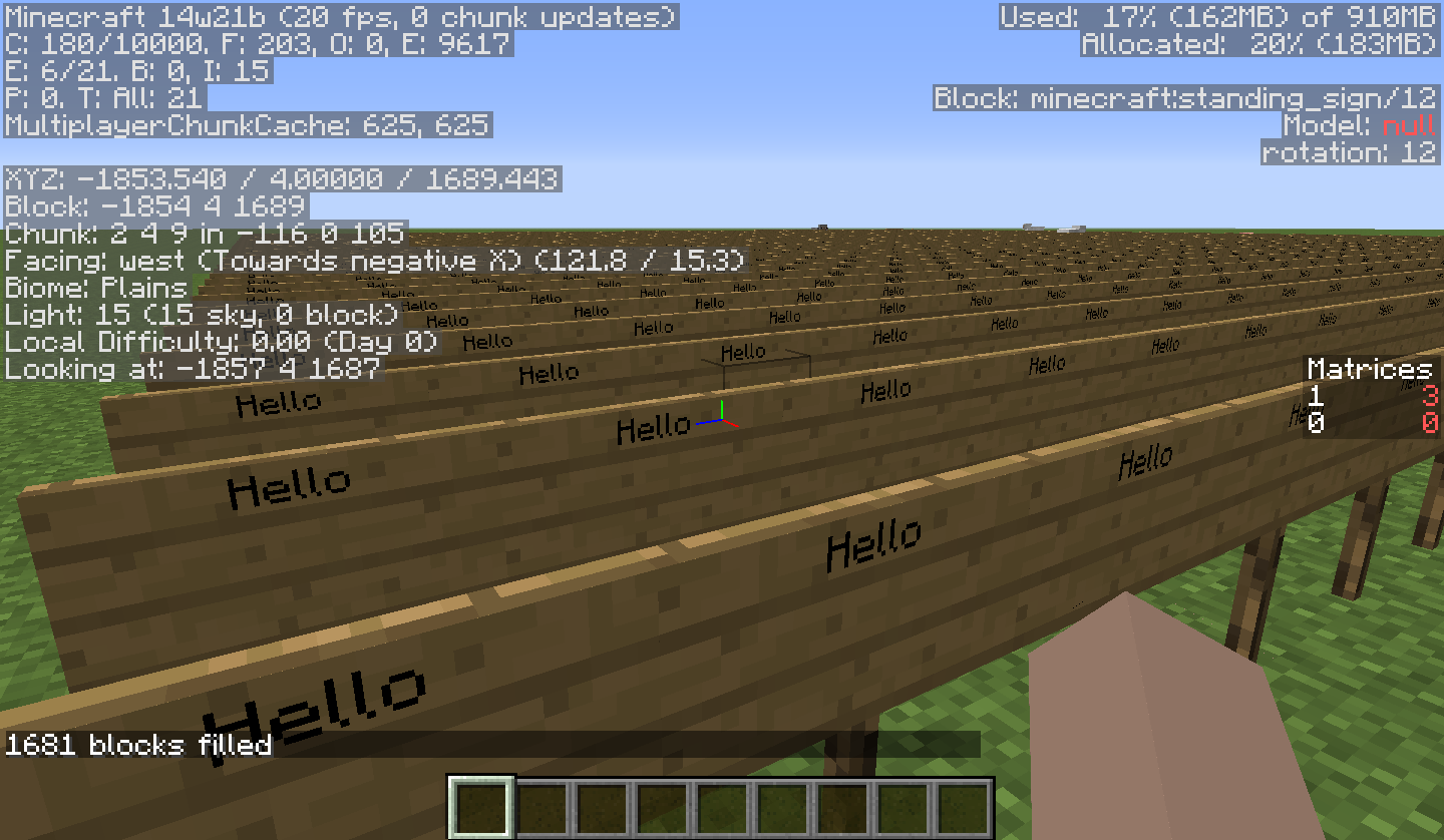 /fill ~ ~ ~ ~-40 ~ ~-40 minecraft:standing_sign 12 replace {Text1:"Hello"}and note the FPS before and after. The screen should noticeably stutter as well.