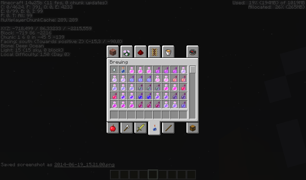 When I opened the creative inventory screen (potions), my fps dropped from about 25 fps to 8 fps.