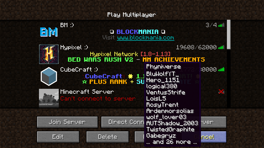 When hovering over a GUI button in the multiplayer screen, if there is a server player count (on hovered over shows some of the online player) under the button it displays the player list. Also happens with "Pinging" and "No connection."
