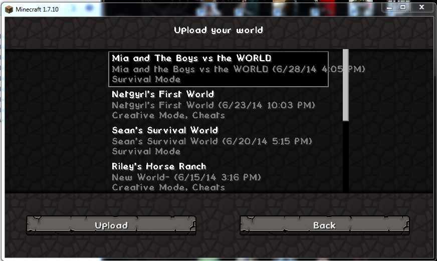 Pick world to upload ("Mia and The Boys vs the WORLD") (screen cap)