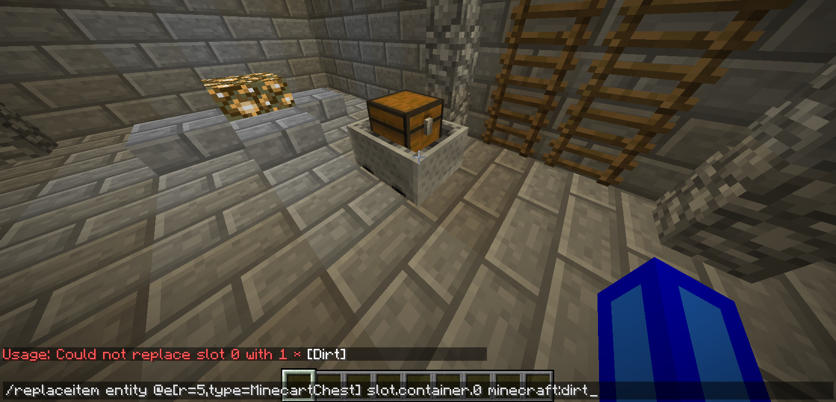 /replaceitem entity @e[distance=..5,type=minecraft:chest_minecart] container.0 minecraft:dirt