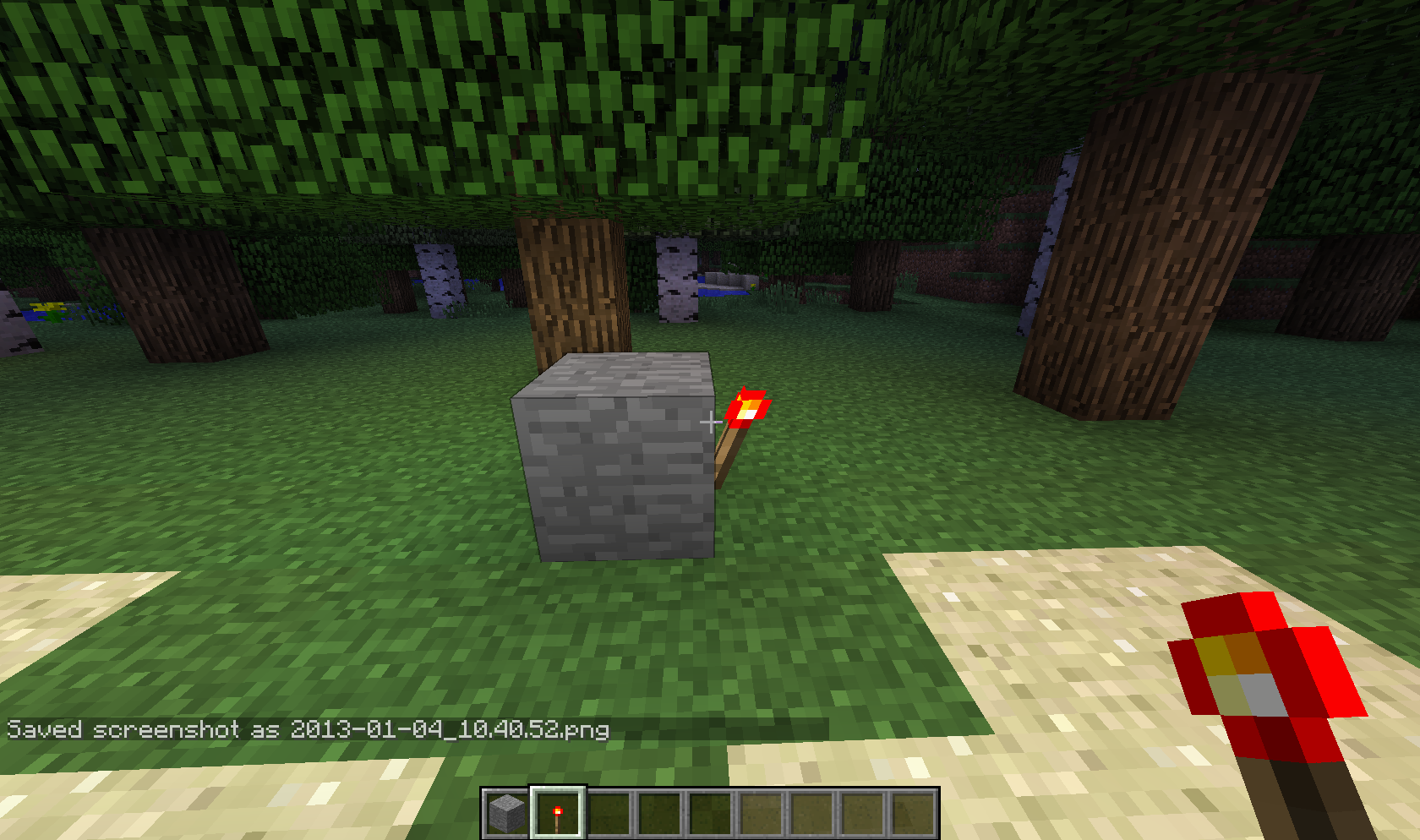 I have been playing around with redstone in the latest snapshot, And discovered a bug. When you place a block and put a redstone torch on the side of that block, and then break the block, the torch will still be there, floating. Check out my screenshots! EDIT: Doesn't happend if you put the torch on top of the block!