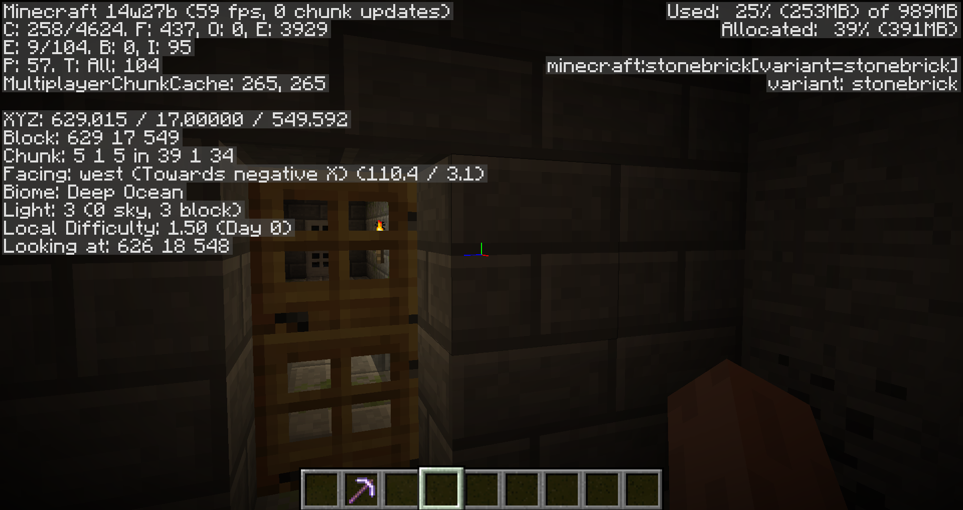 Found my way into a stronghold in 14w27b. Seed 4794933921088204539 Coords x629 y17 z549. Screenshot included. I noticed all the strongholds' doors are 2 top-of-the-door blocks instead of normal doors. So I switched to creative to give myself a door and place it. Placed doors turn out normal. It's just pregenerated ones that are the problem. Trying to interact with the broken doors (asking for trouble I know) they have a hitbox on the top block only, and clicking on it makes the noise but doesn't open the door. Using gamemode 3 to ghost thru the door, switching back (creative) and trying to open the door from the far side crashed the game the first time I tried it but didn't the second time. The second time it crashed when I clicked on the bottom.
