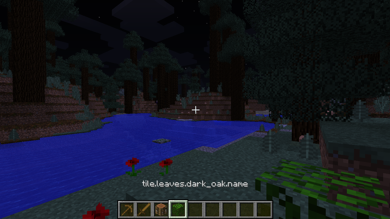 When I was playing creative mode and building stuff, I found that Dark Oak Leaves do NOT have a proper name. it says something like: tile.big_oak_leave.name.