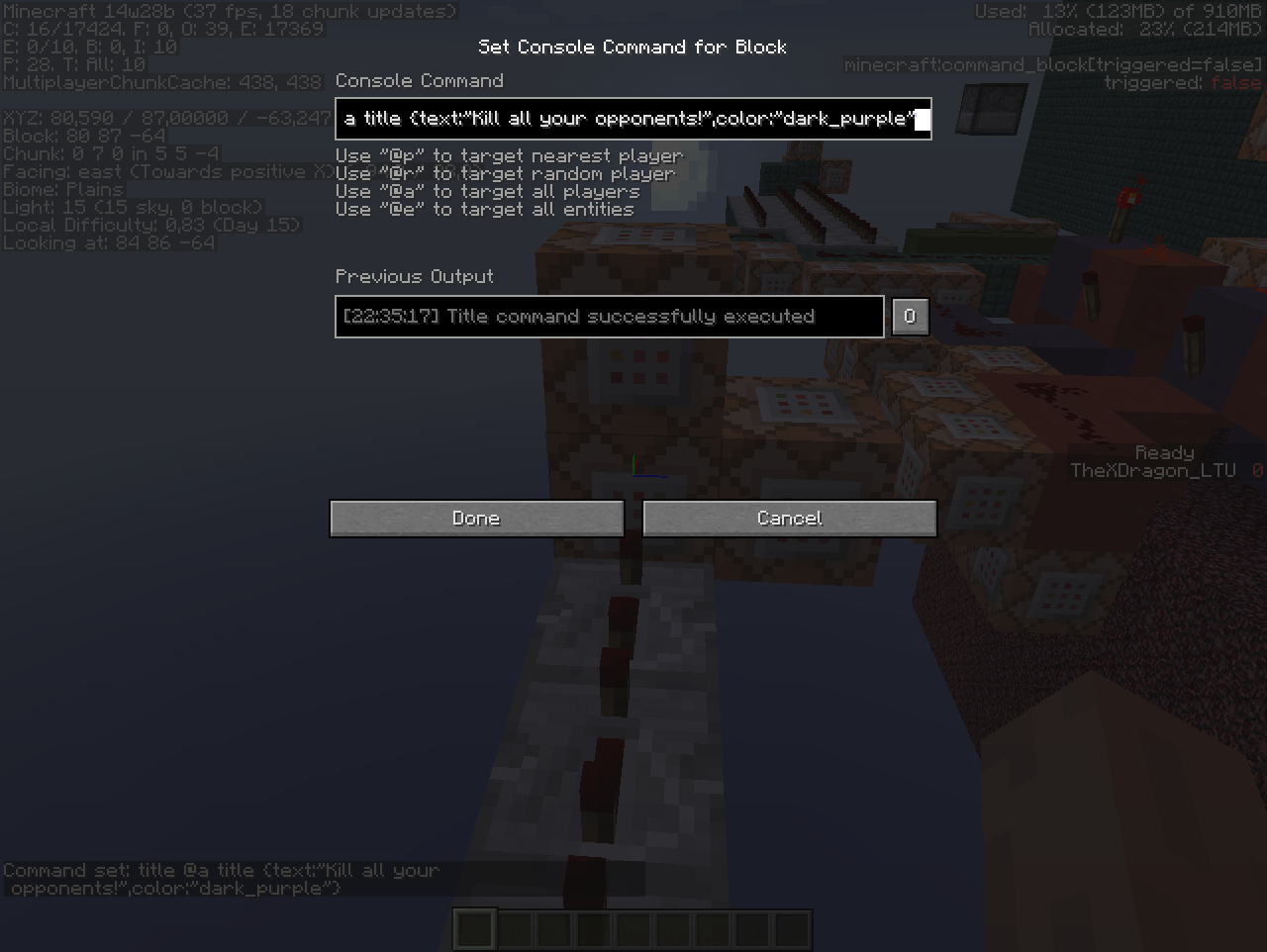 /title @a title {text:"Kill all your opponents!",color:"dark_purple"}"Yes I saw the e as well, after I uploaded it 😃 , but if I delete it it still does not work on multiplayer, the way I saw this bug I was working In SinglePlayer on PvP map that uses titles(about 20 of command blocks with command /title) and I saw that none of them worked when I uploaded the world to my server and none had an e behind them(exept this one 😃). The Issue is still not rewsolved In snapshot 14w28b, sorry for my tiny mistake in previaus update, I have uploaded a new screenshot of the command and its output.