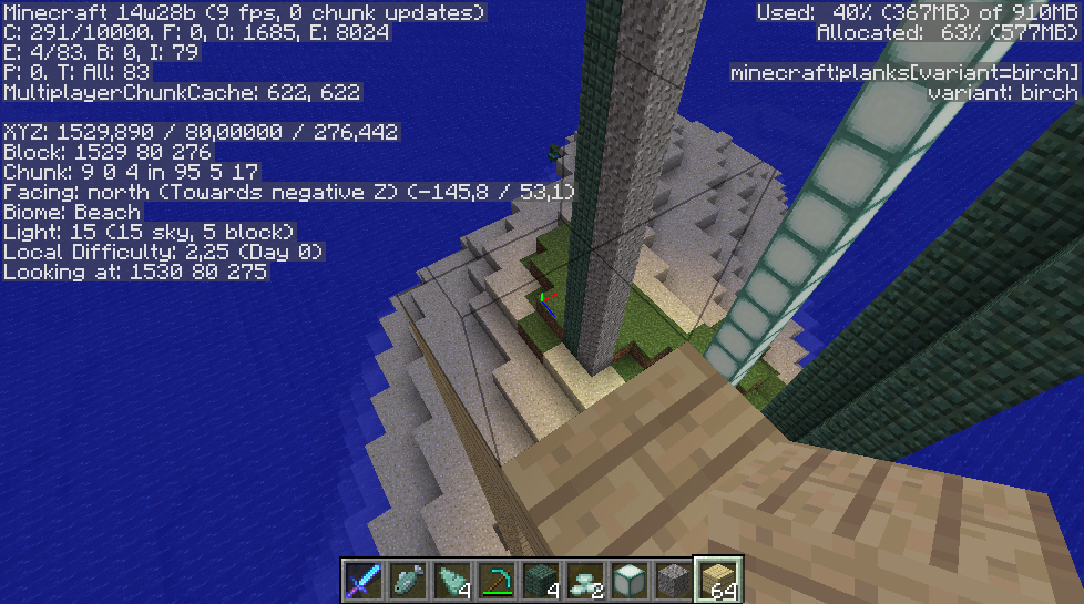 When pillaring up in a straight column, at some point Minecraft starts to render transparent blocks. (attachment: pillar 1) If you log out and log back in, the blocks will be visible - but starting a new pillar or continuing to built on the previous one will render blocks again invisible at some point.