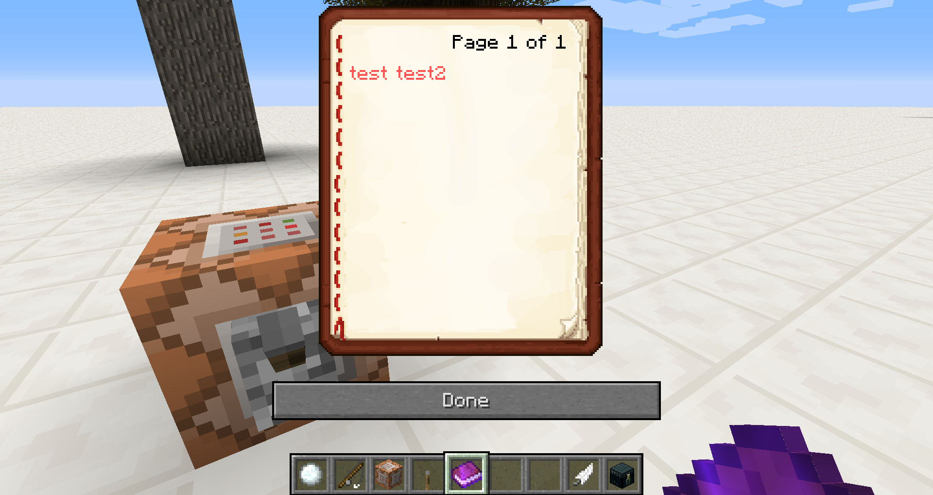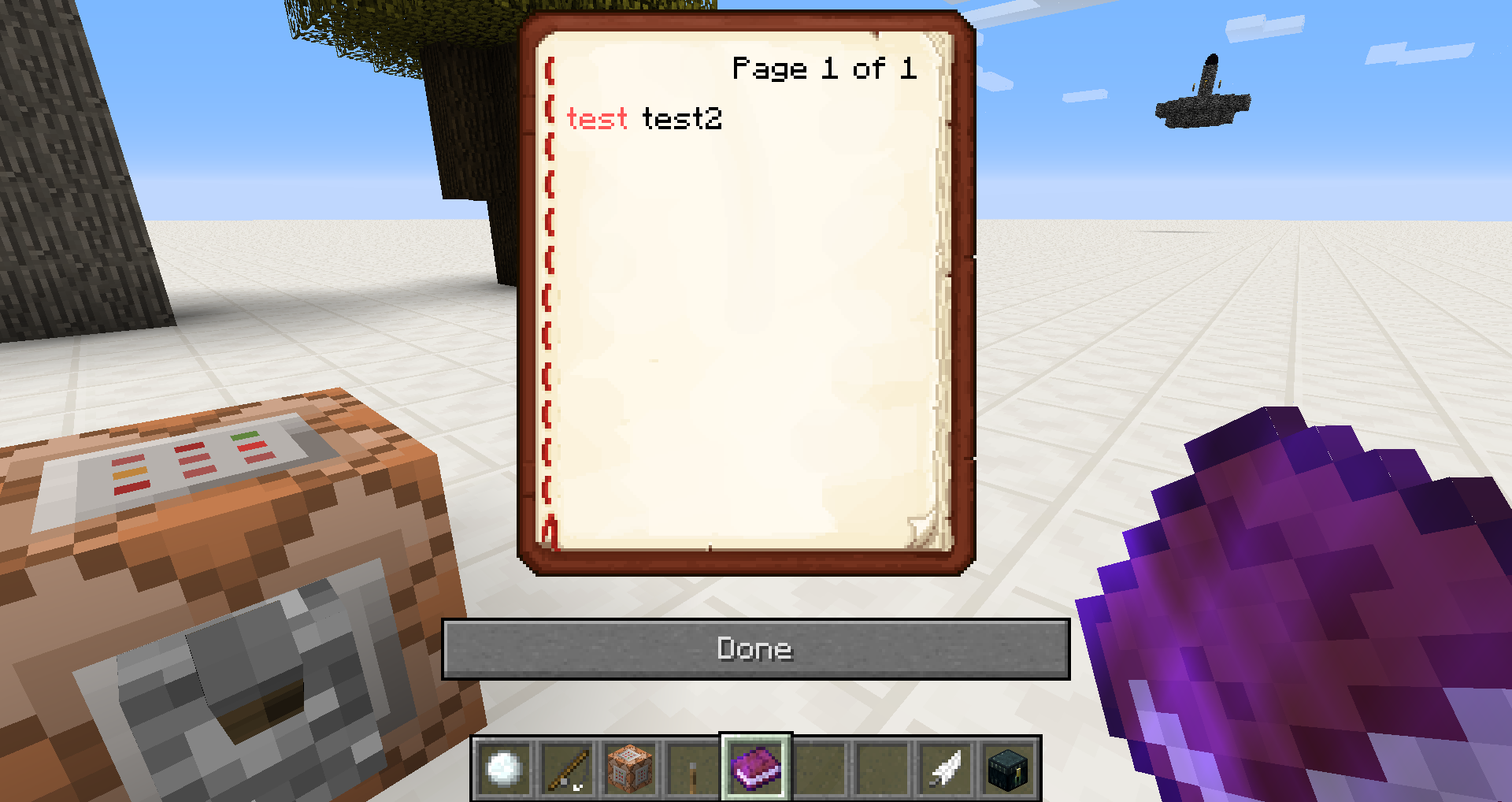 give @p written_book 1 0 {author:"Juzim14",title:"",pages:["{text:\"test\",color:red,extra:[{text:\" test2\"}]}"]}does this (picture 1), but should do this (picture 2). Please fix, that is really annoying if you want do sth with clickEvent.