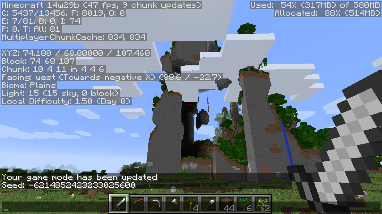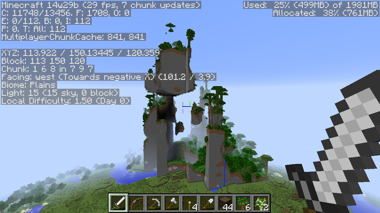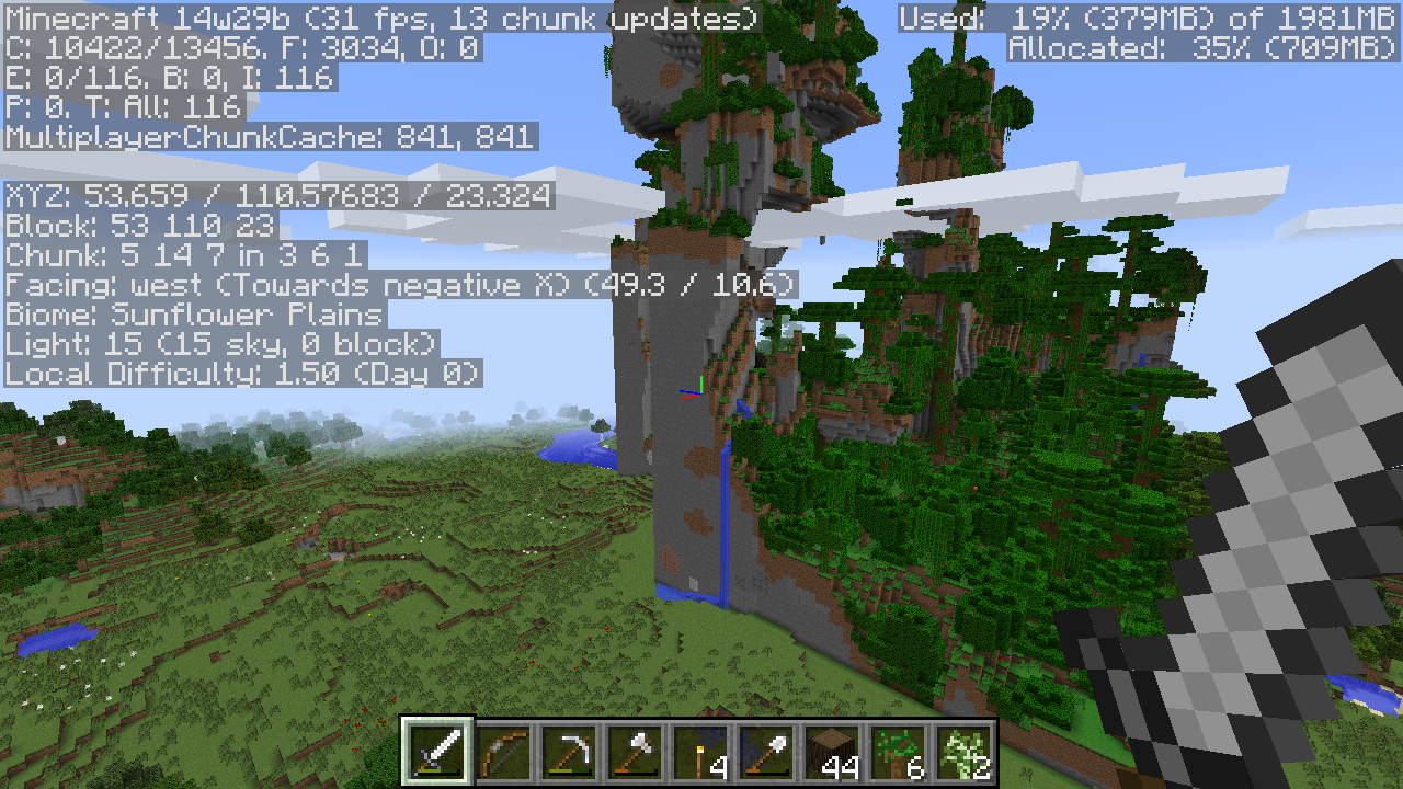 The second screenshot and after have more memory allocated to mine craft in them because the game kept freezing as I was flying around trying to get them.