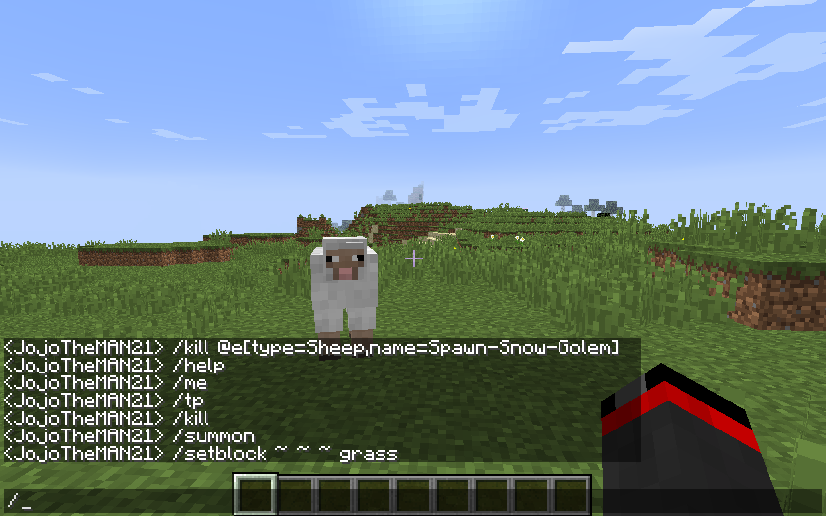 The weird part about it is you can do any command. All you have to do is press the up arrow or re-paste and then delete until the / is left. Then type away! /help, /setblock, /summon, /me, all of the commands are then broken. You can even type your own command, like /sit or something.