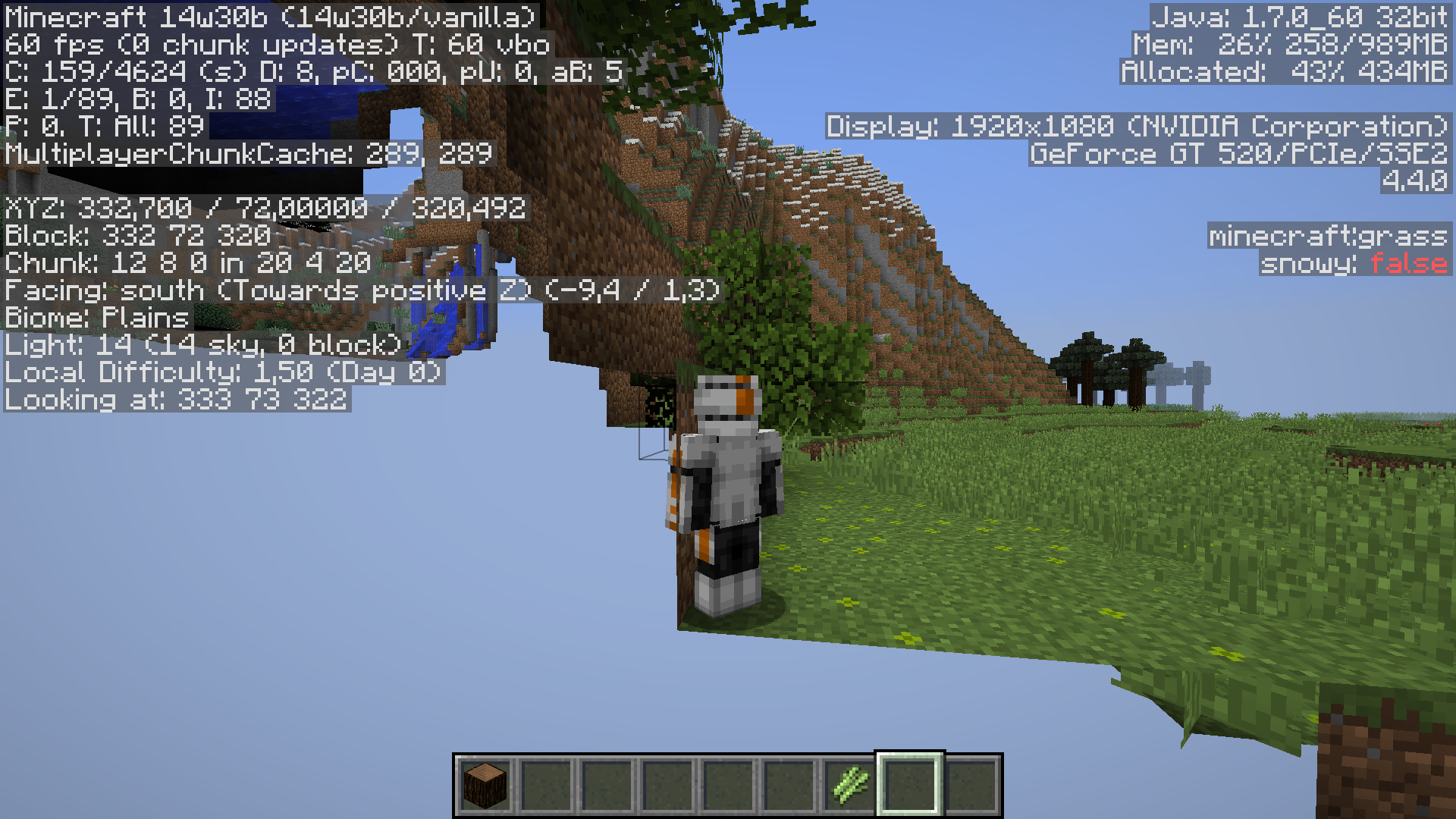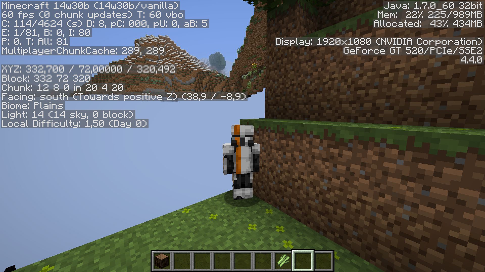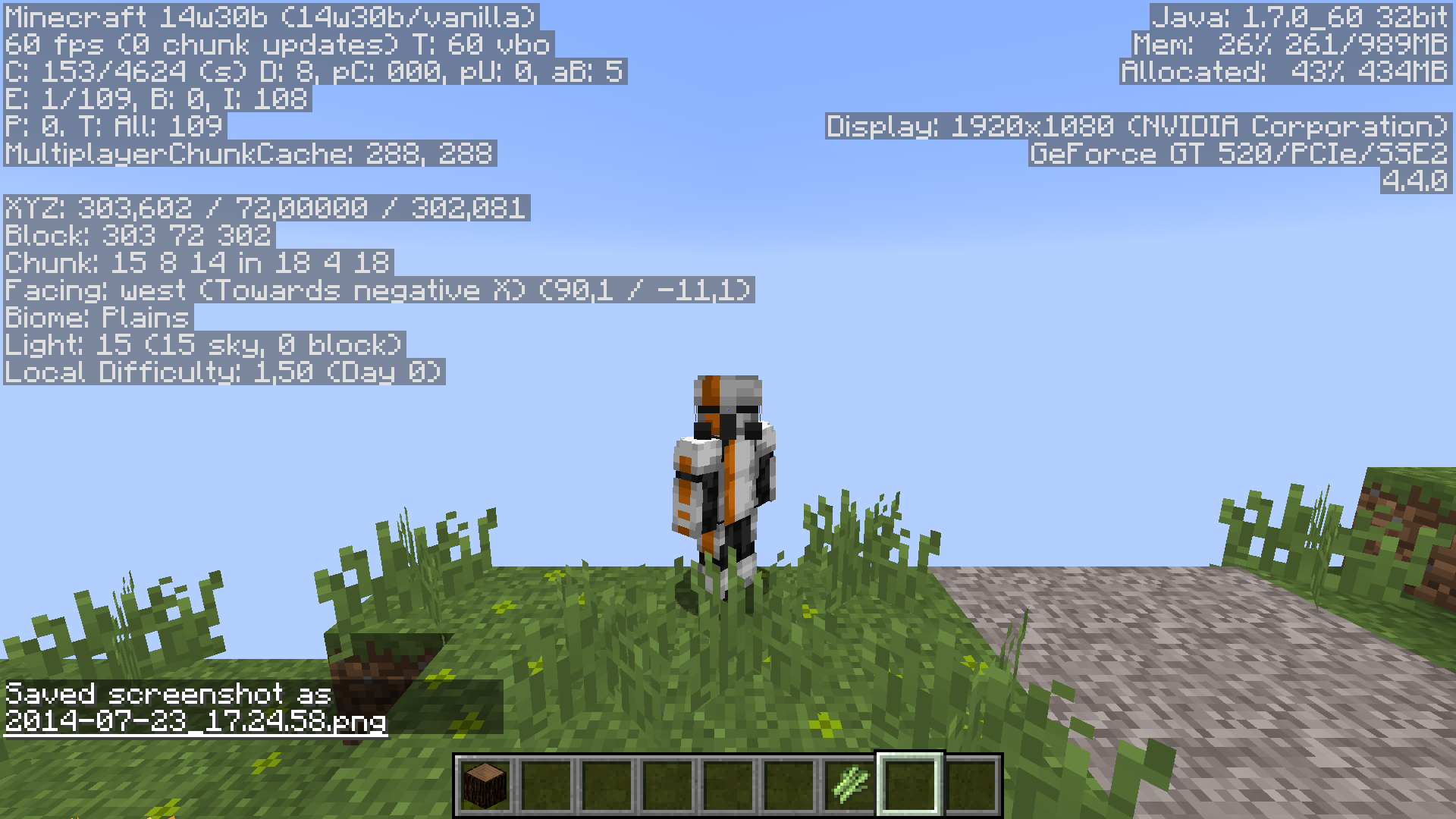 Now turn around with your mouse but don't move your feet, so that you can get a good look at the small hallway you are in. Face your character squarely toward the end of the hallway you are in (as though your character were in time-out, or something. Bad Steve! lol) and then press F5. If it appears as though your 1x1x2 end of the hallway is floating in the sky, then you have successfully reproduced MC-63070. If not, then at least try moving the mouse about until you are certain the camera is at the opposite end of the hallway from you, similar to my screenshots.
