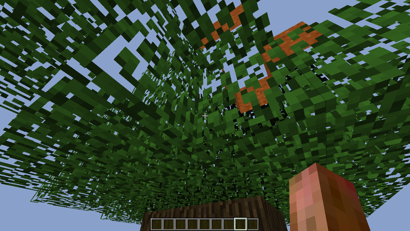 The graphics revert back to normal when the chat is shown, or whenever the inventory is hidden - and it doesn't matter what item/block you are holding. It remains glitched even when paused or when viewing the F3 debug screen. It occurs with all leaf block types, and can even be seen in the creative and survival inventory, as well as when held.
