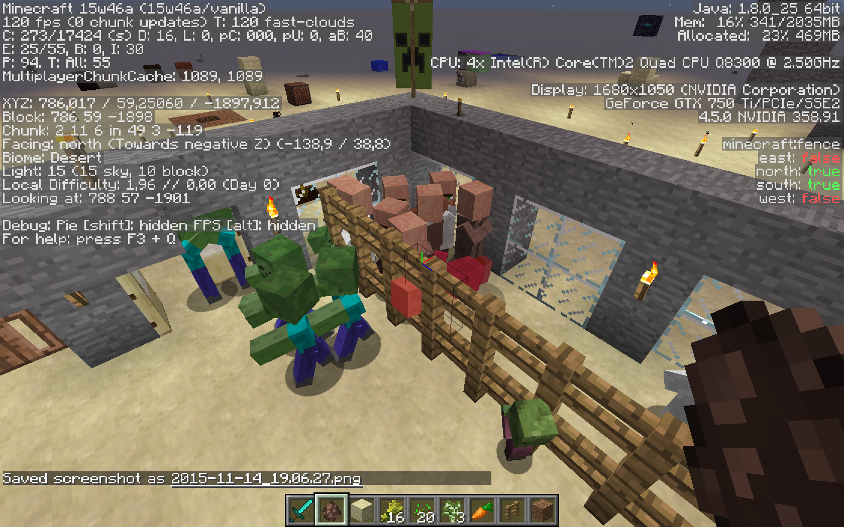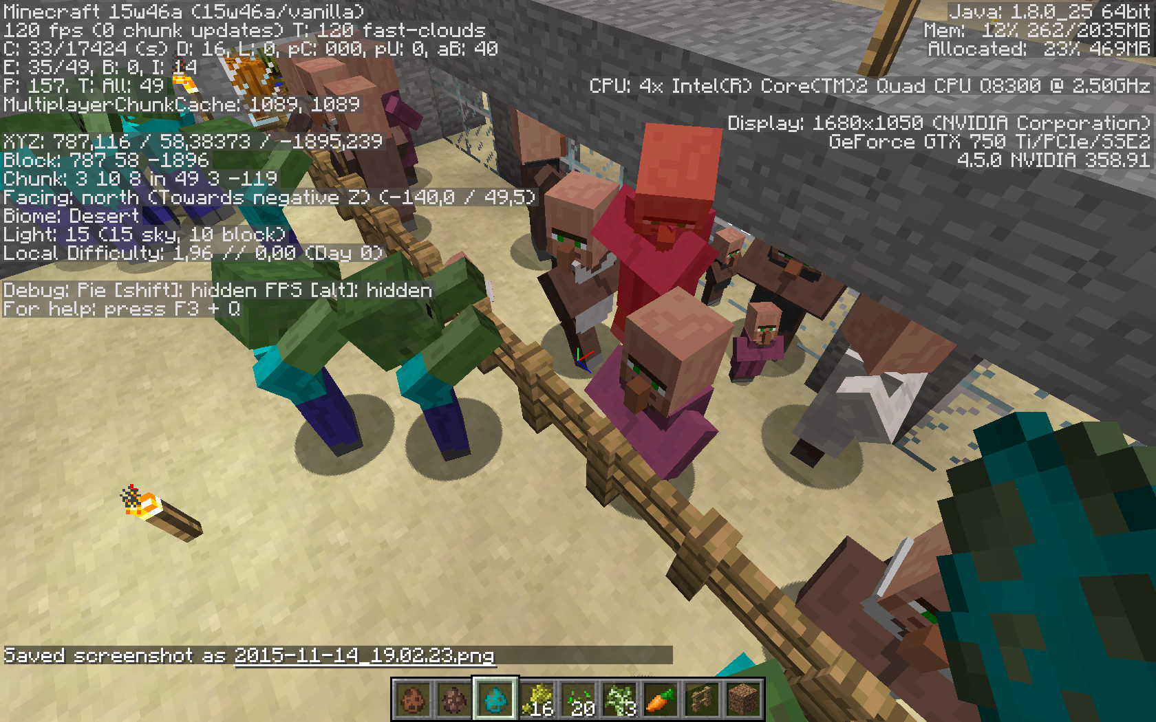 To reproduce, go into a creative world and spawn a lot of villagers in a pen of one high fences. Then spawn lots of zombies on the outside. The zombies will attack the villagers. After that follow those steps again except this time using two high fences.