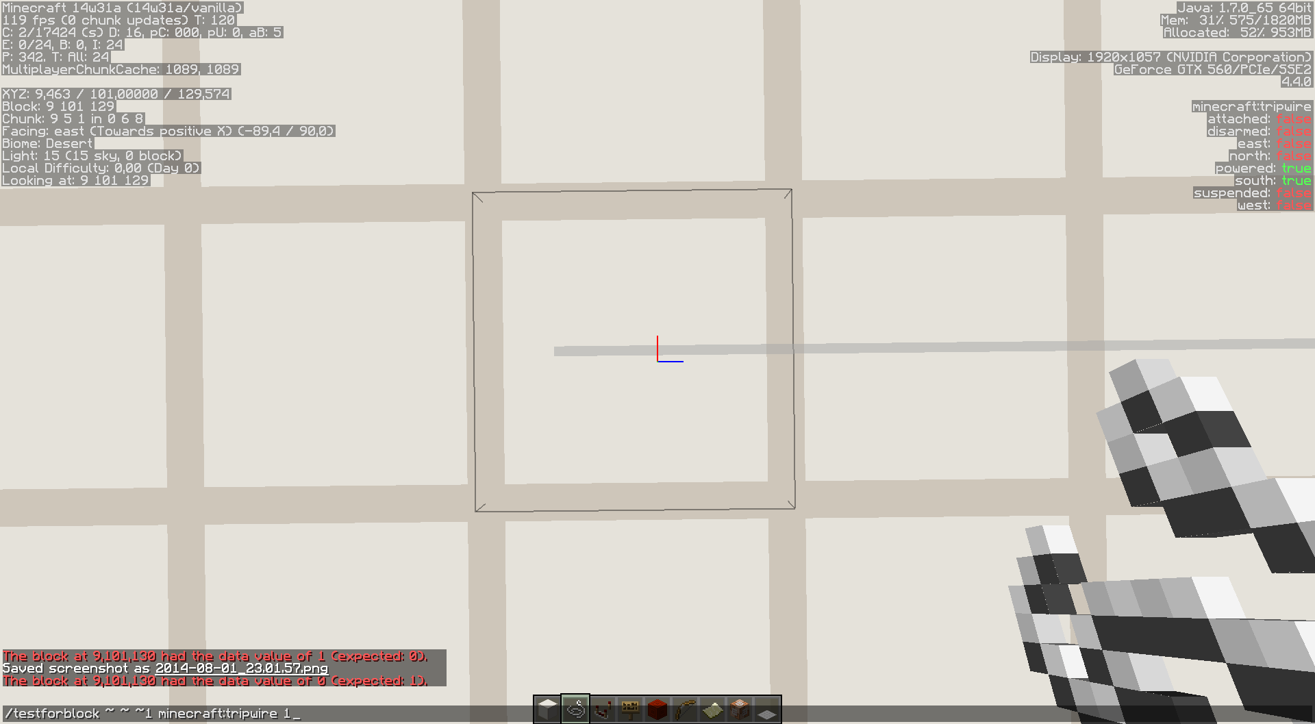 /textforblock ~ ~ ~1 minecraft:tripwire 1and it returned "The block at 9,101,130 had the data value of 0 (expected 1).". (Image 2)