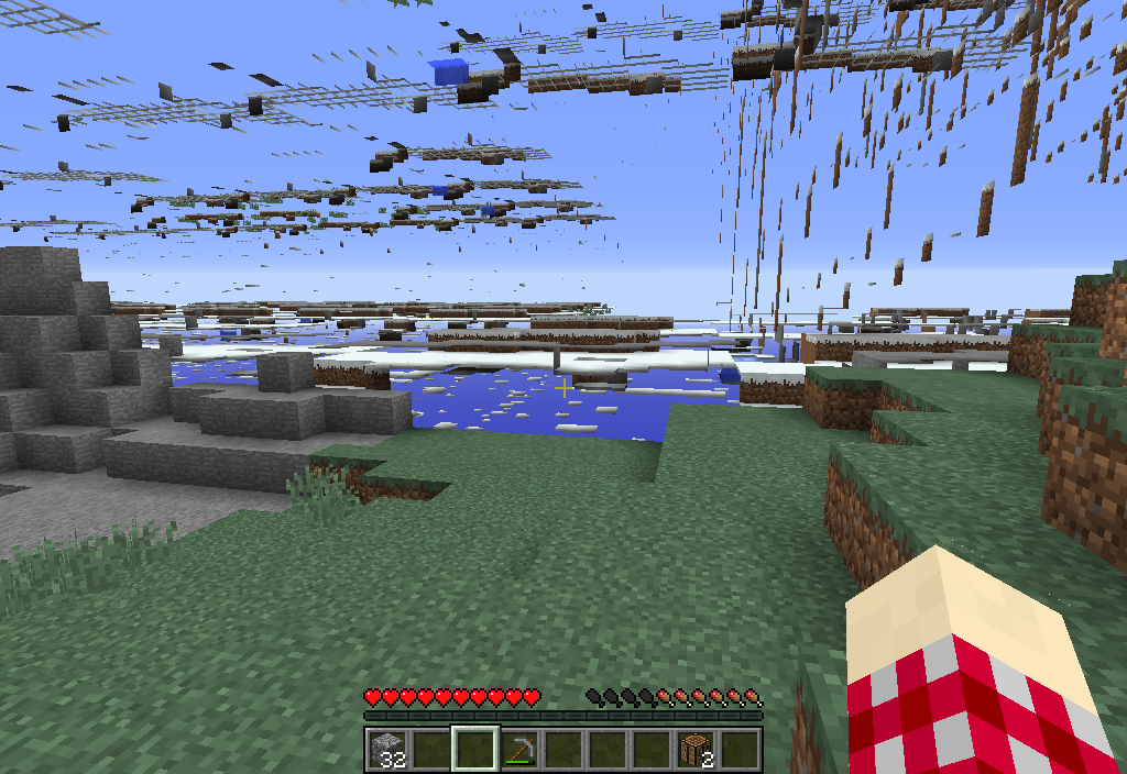 Upon changing the render distance slider to anything above 12, the chunks in the distance stopped loading and instead had an odd graphical error that caused them to appear the same and shift rapidly through differently looking glitched appearances. Getting close to and standing in and around the glitched areas had no affect on them. The terrain seemed to be fine, but what I saw was not what was there.