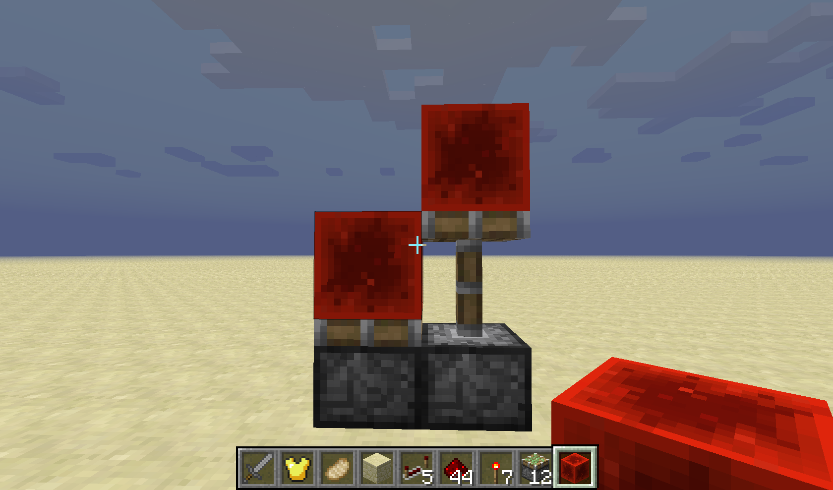 A piston beside a piston with a redstoneblock above extended after putting a redstoneblock on the it.