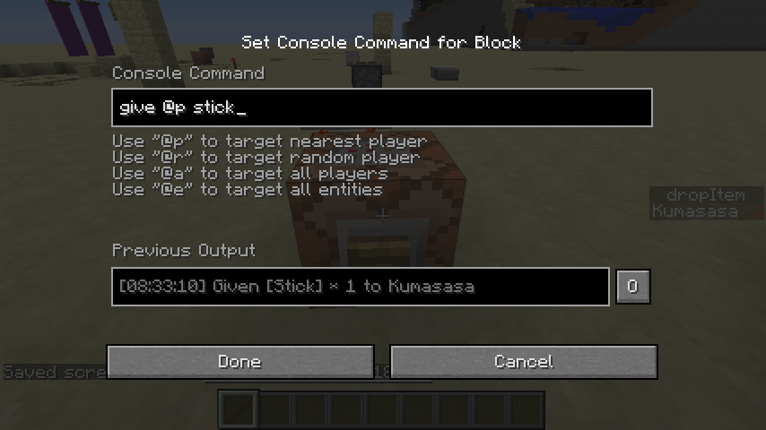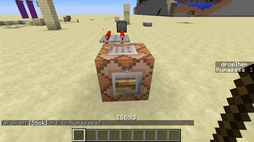 When using "/give @p stick" in a command block, the player is given a checkered image. To reproduce, get a command block, type in the command above, and then activate the command block. Voila! You have yourself a broken image! These also cannot be used to craft any items. In addition, these items don't stack with regular sticks from the creative inventory. Finally, if there are any other sticks in your inventory, it will correct the image, but still seem like it is broken when entering your inventory. Could possibly be a dupe of MC-50998 but I thought I would share this anyway, as MC-50998 talks specifically about blocks and going from 1.7 to 14w31a, whereas this talks about 14w31a itself. Do what you will.