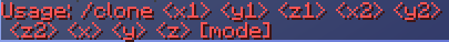 /clone <x1> <y1> <z1> <x2> <y2> <z2> <x> <y> <z> [[replace|masked] [mode2]|filtered <mode2> <TileName> [dataValue]]
