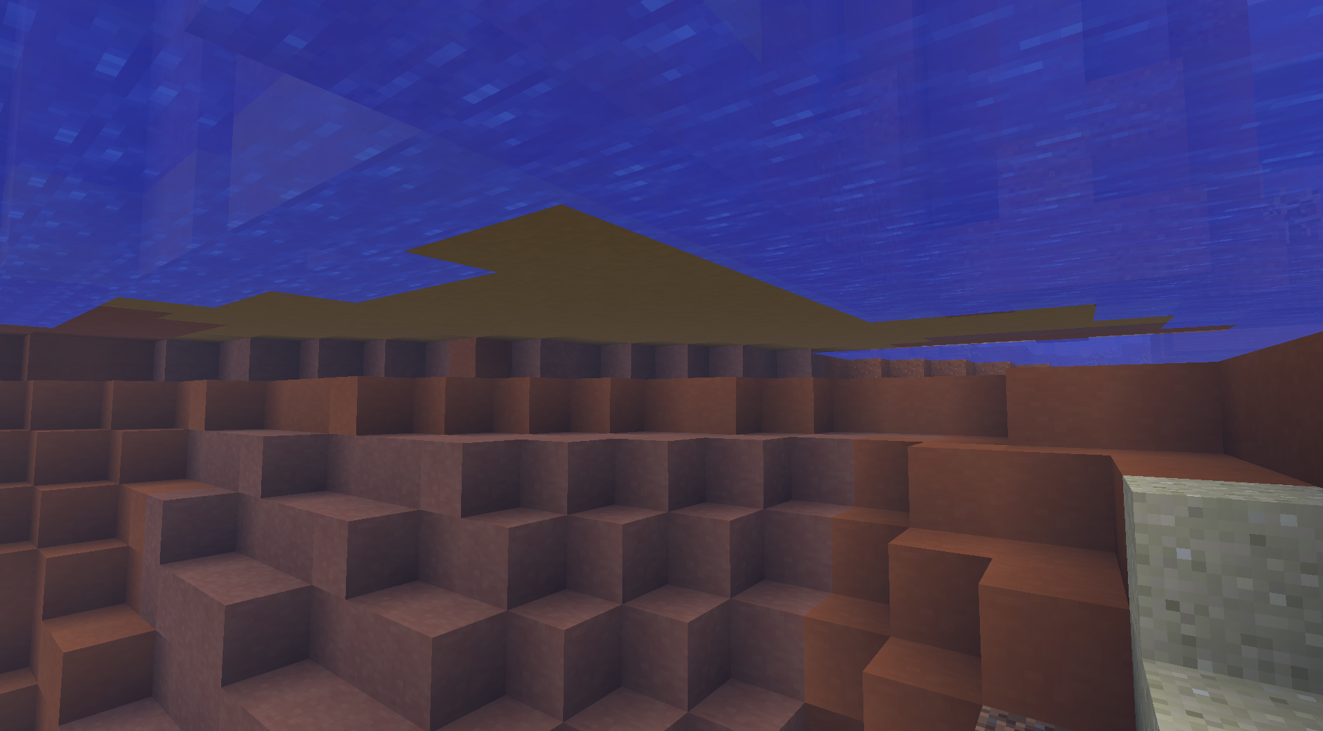 In a newly-created map, near spawn there is a very large Mesa biome that contains a smaller Bryce variant with a river running through it. Near the edges of the river, the edges of the Bryce variant appear to stop generating blocks normally over the water. That is, some of the land sits atop the water without actually continuing to where you'd expect its base to be.