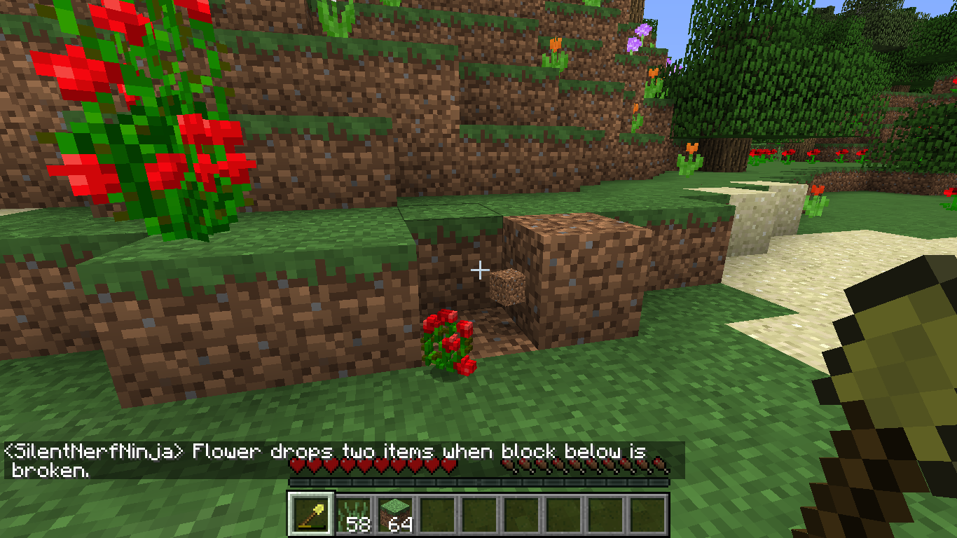 When the dirt below a two-block tall flower is broken, the flower drops two flowers instead of one, allowing duplicating.