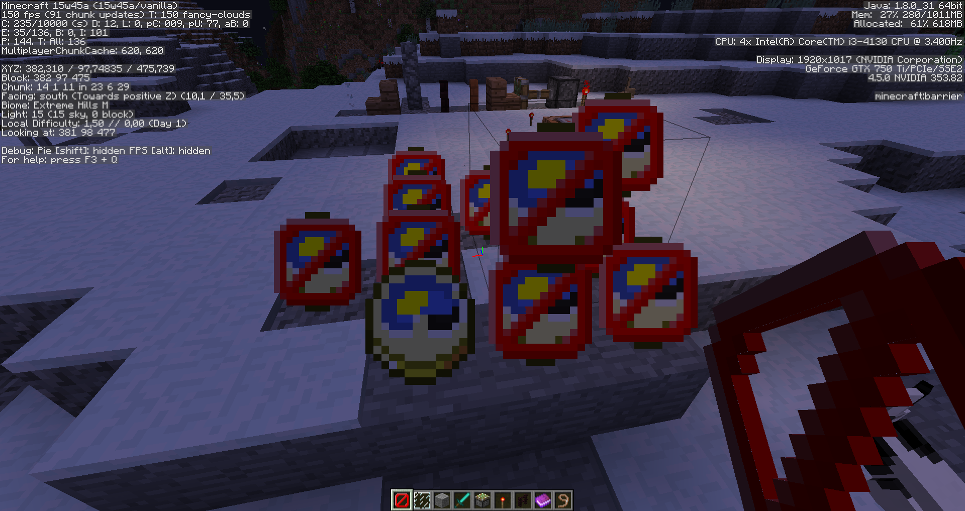 If you change the resource pack while the barrier particle effect is visible, it glitches the texture. Seems to display a random texture behind the barrier, I've seen it do bowls and cyan wool.
