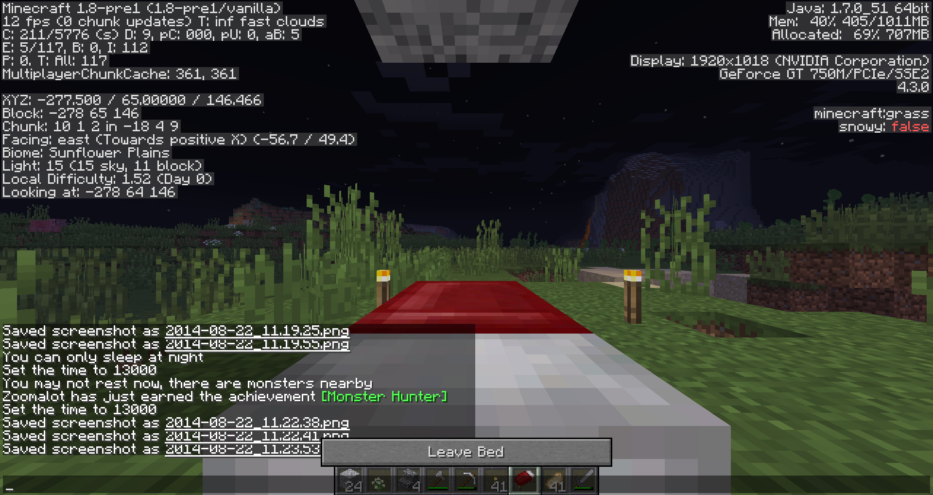 when i sleep in a bed that has a block 2 spaces above the head of the bed it causes my character's visual to slide off the bed. this only occurs with whole blocks above the bed. does not work for fences, slabs, stairs or other partial blocks. also, this bug is best viewed with the bed facing east to west because i only slide off to the south. if the bed is facing north to south, the visual slides backwards or forwards off the bed( to the south)