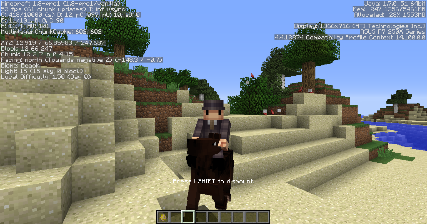 Maybe it's just my computer, because I tried summoning a horse with the /summon EntityHorse command, and i was still unable to ride it, even in 1.8pre-3, so i'm a bit out of it, not something i'm too worried about though. I don't ride horses often
