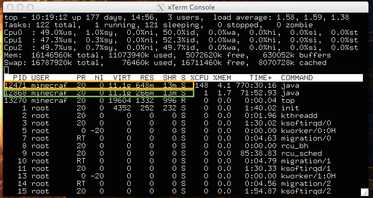 Screen shot is linux "top" command. Both servers are with the same world, same everything actually, just in different folders, and using different minecraft_server jar files. Both servers have 0 players logged into them.