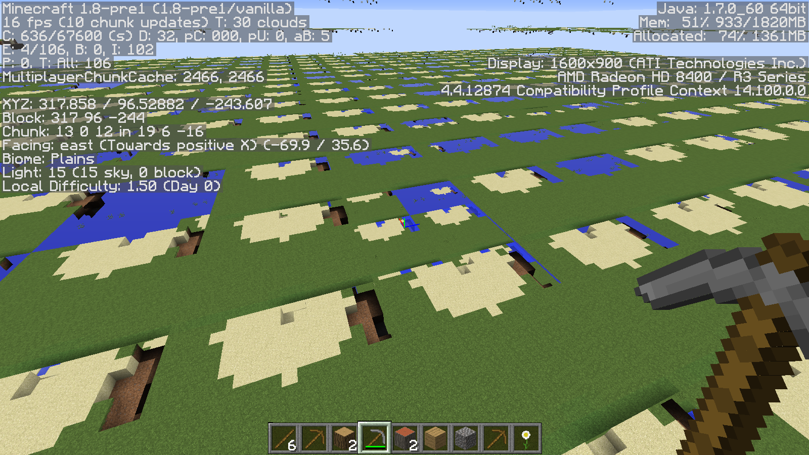 When I set the render distance to 32 chunks, some chunks seemed to be rotating through a bunch of different environments as I moved or looked around. trying to land on it and get it to load didn't help, nor did updating blocks in the affected area. I've included a video (I don't have a way to record the screen other than with my cell phone, sorry for the quality) of what is happening, since it's not easy to describe. I'll also include a screenshot with the debugging screen.